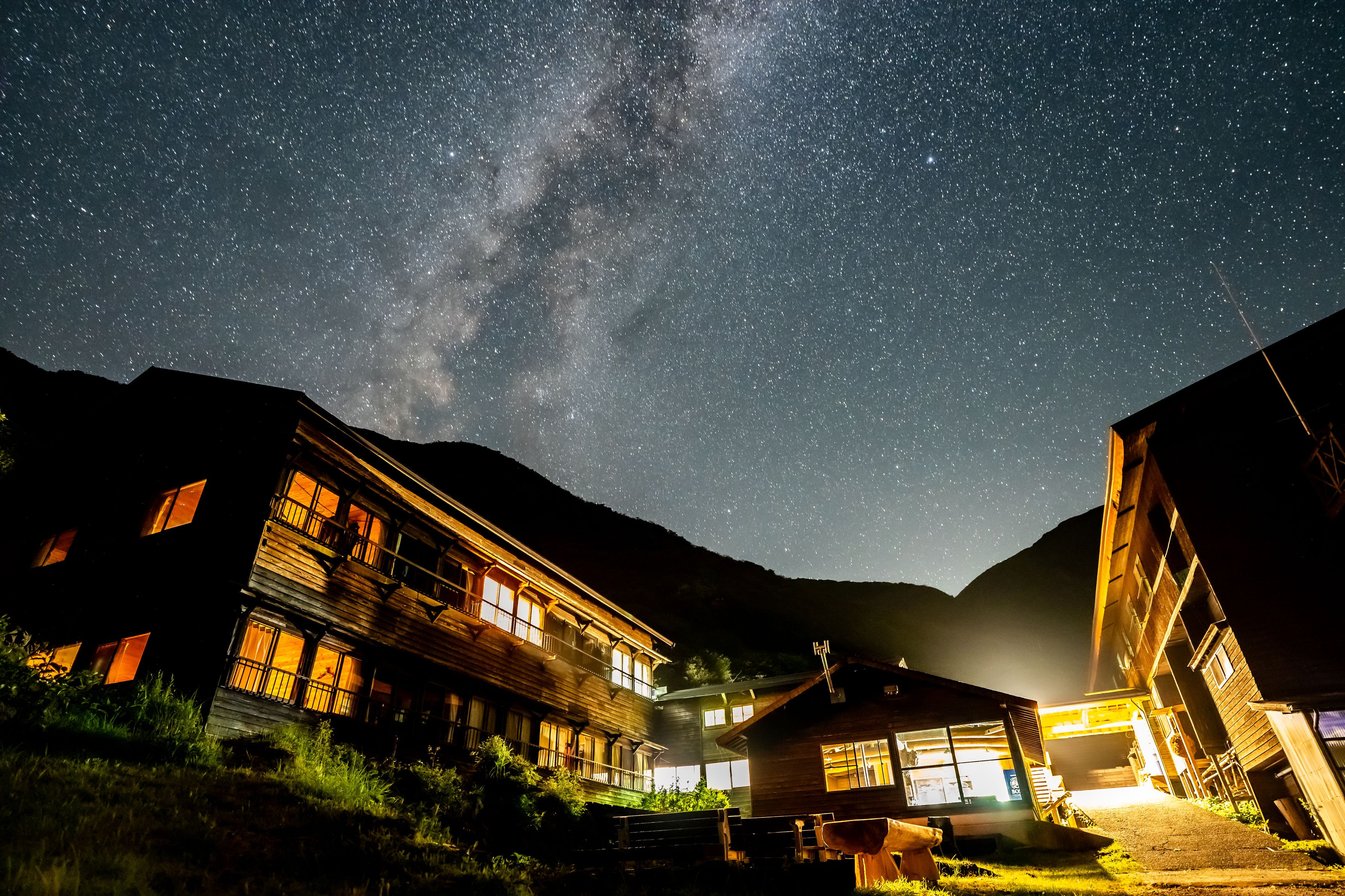 九州最高峰の温泉、法華院山荘の夜。天の川の方向へナイトハイク。山荘の常夜灯と星の光がマッチした空間でした。