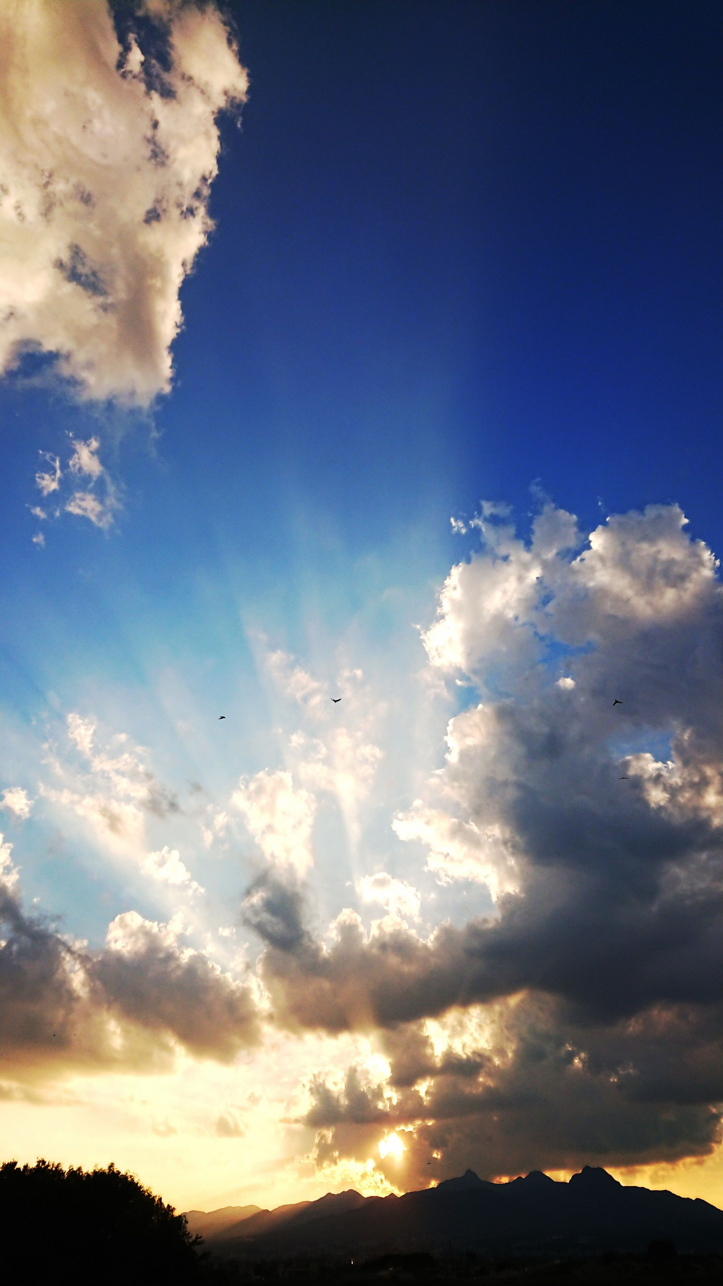 夕暮れの空を撮ったら、飛んでいる鳥達が写って、夕陽からの光と相まってすいい感じになりました☆