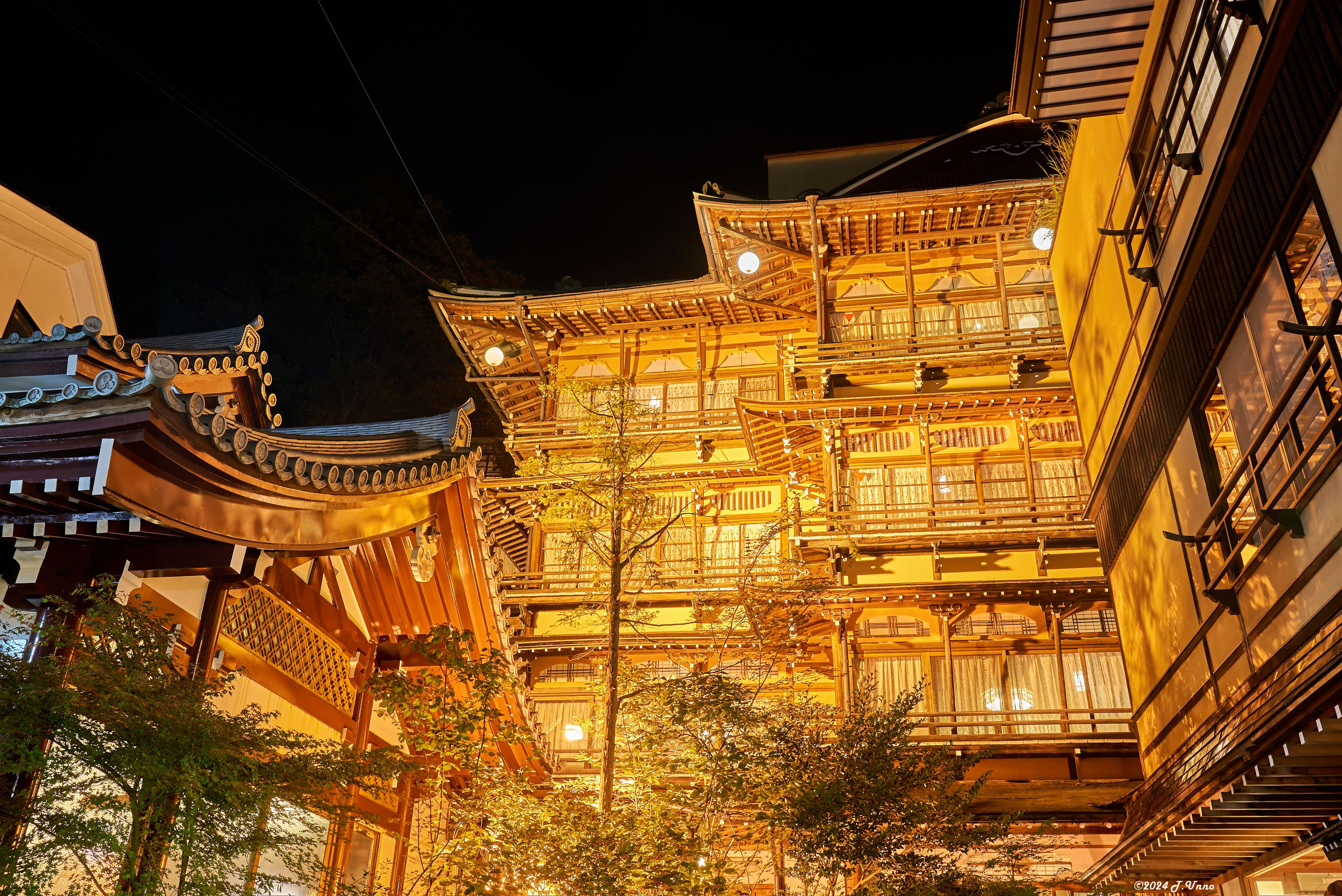 映画「千と千尋の神隠し」の湯屋のモデルになったともいわれる宿のひとつです。 ライトアップされた姿は圧巻でした。