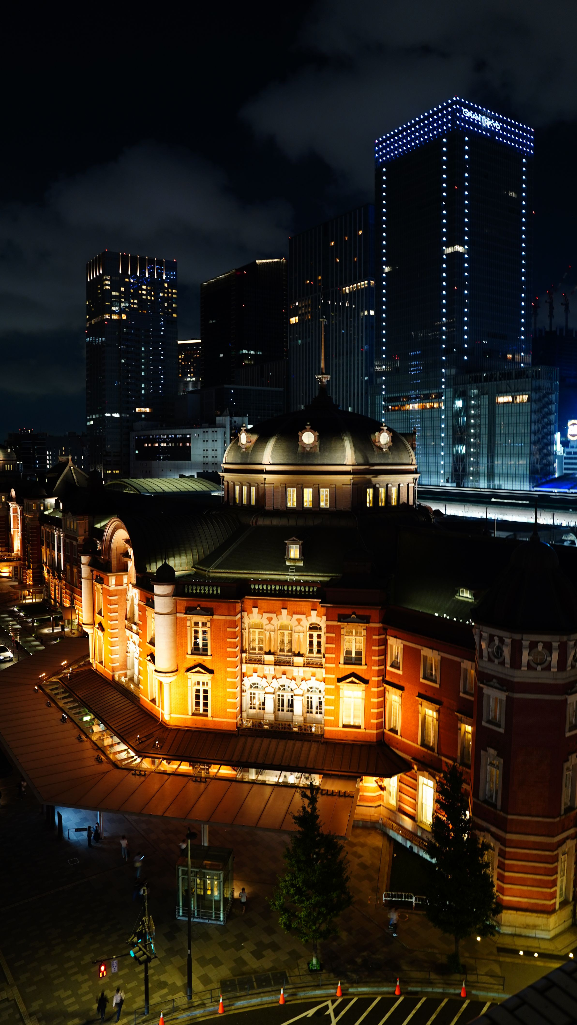 背景の青、東京駅のオレンジ、道路を入れたくて頑張りました。KITTEのテラスはデートスポットでした。