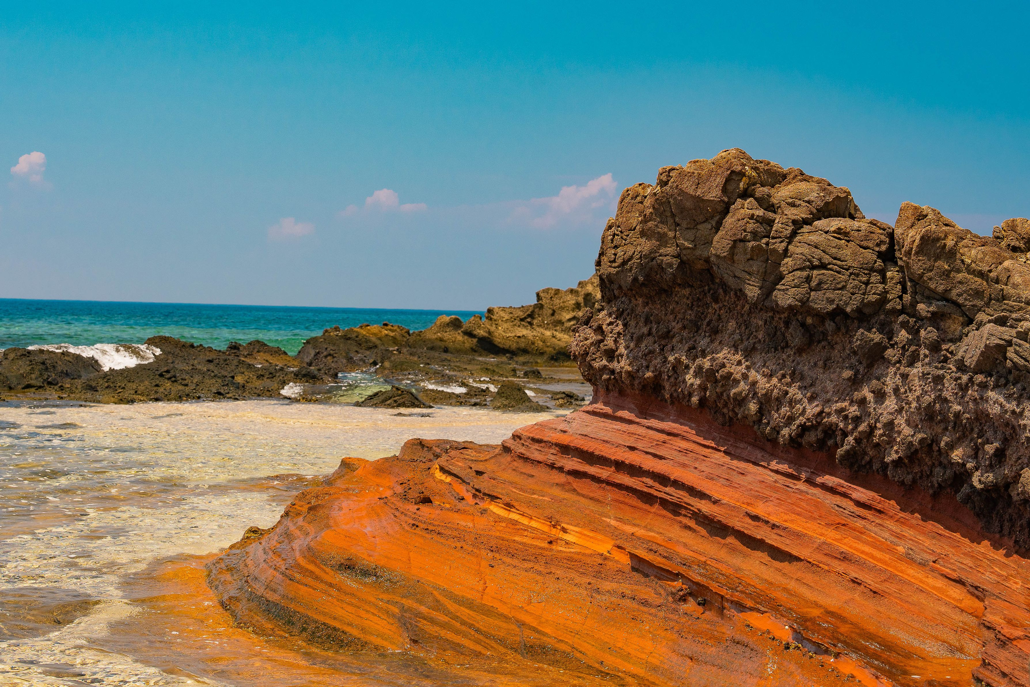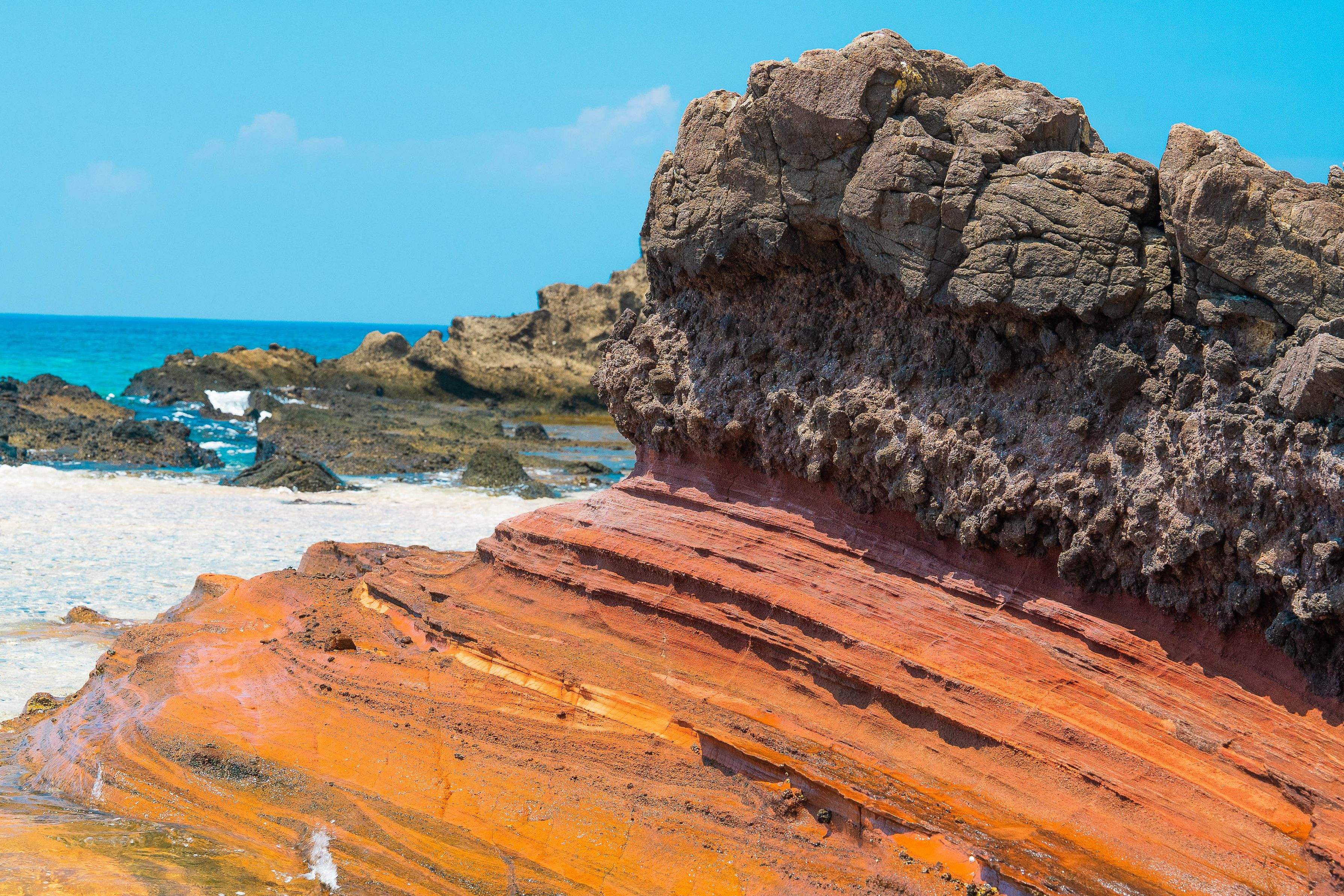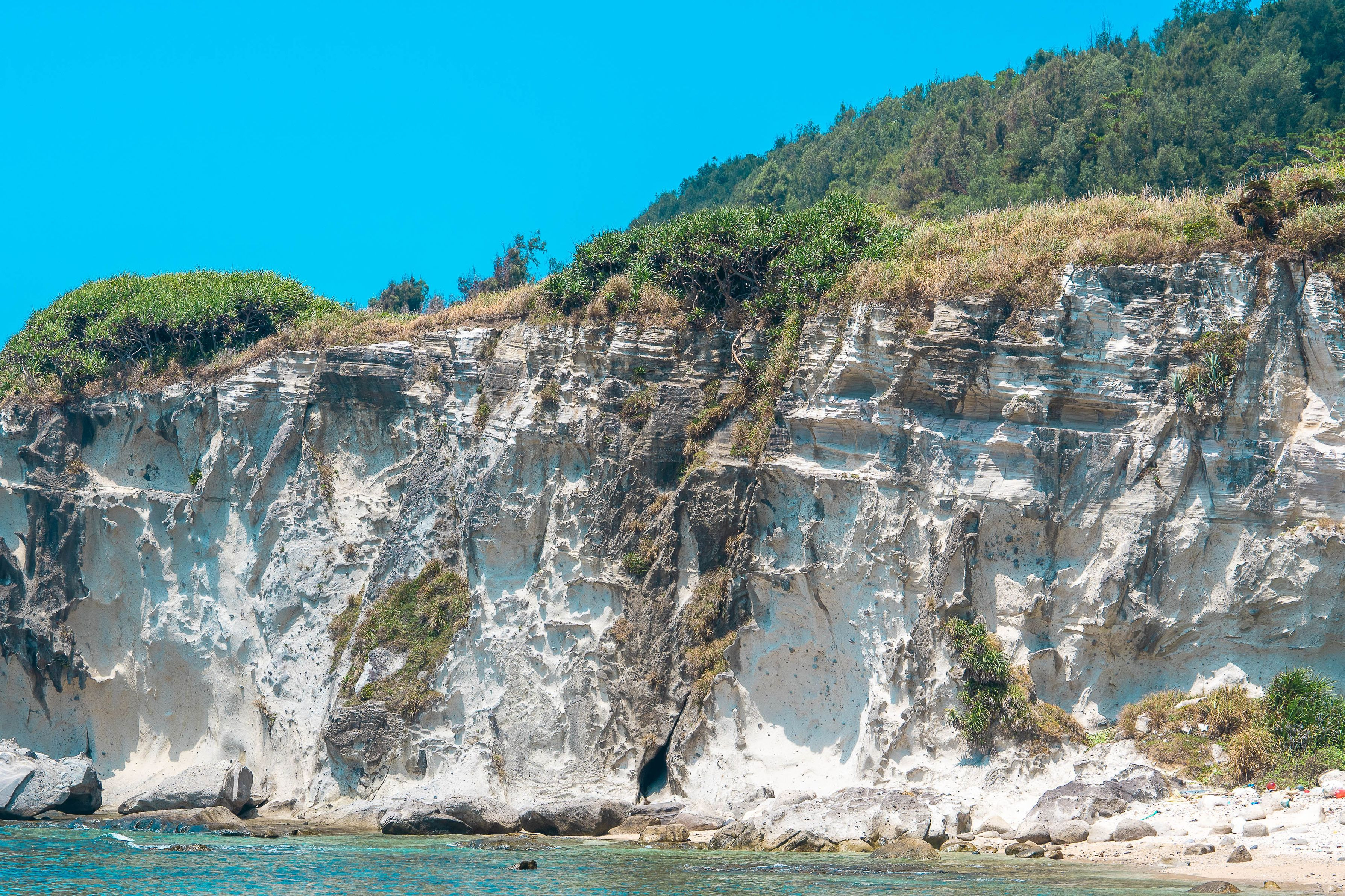 2024.08.11|沖縄県 粟国島 ヤヒジャ海岸 かつて粟国島が火を纏った時代の記憶を刻む黒い地層から、幻想的な白壁へと続く神秘の場所。そびえ立つ白色凝灰岩の崖は、まるで大地が息を呑む瞬間を閉じ込めたかのように静かに佇み、見る者を異世界へと誘う。