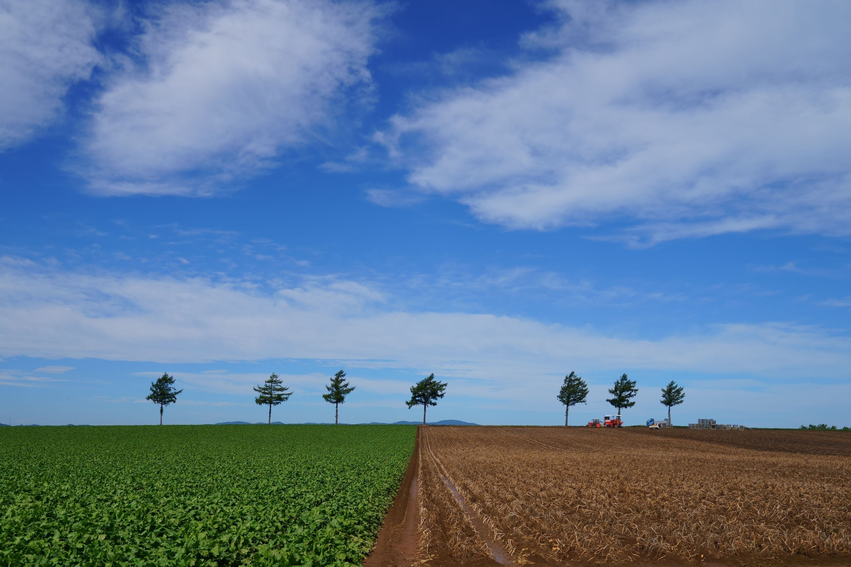 有名な女満別のメルヘンの丘です。半分ジャガイモの収穫が終わった赤土色と半分残っている緑の葉の色の組み合わせとバックの青空が絵になったので撮ってみました。