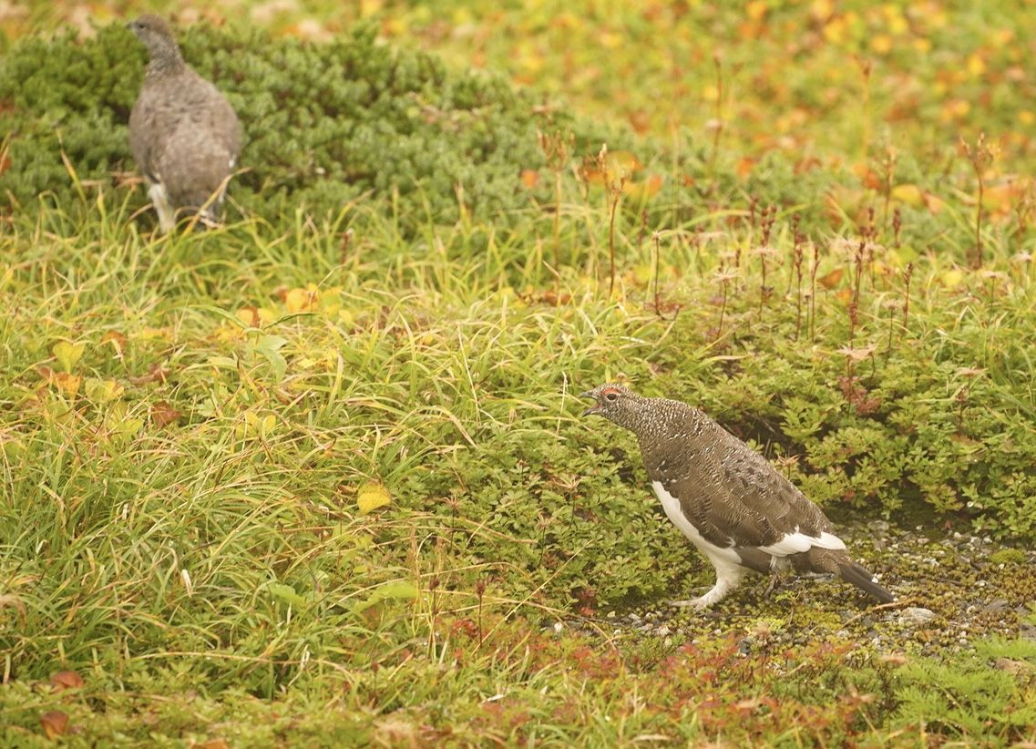 天気が悪いと出没しやすいという雷鳥 遠くにいたが数羽で近くまで来てくれました。ショータイム。