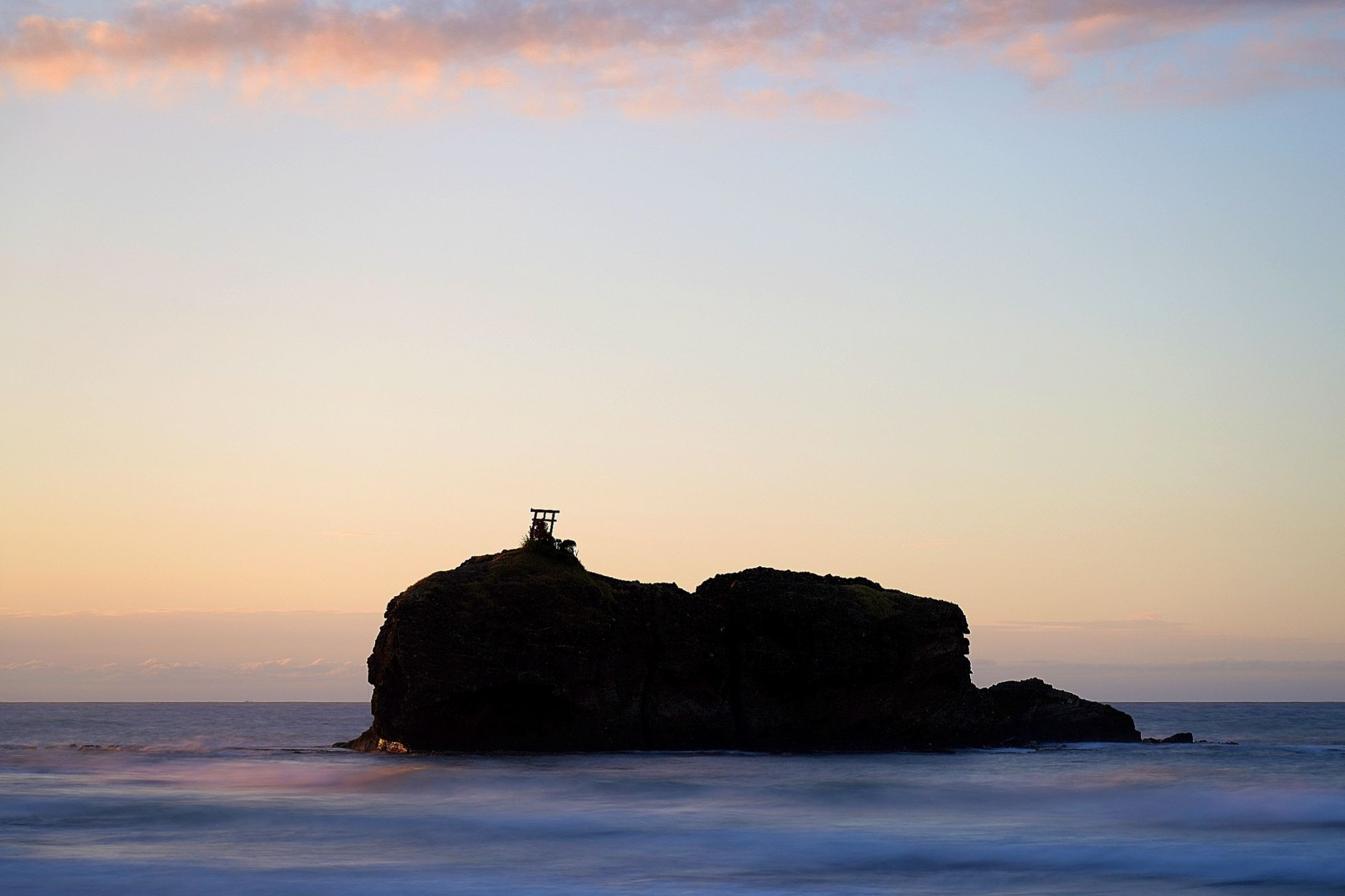 鳥取市白兎海岸の鳥居のある島 白ウサギがサメを騙してピョンピョン海を渡り、怒ったサメに毛皮をはがされた白ウサギがたどり着いた島。島の形がウサギに見えるそうです。