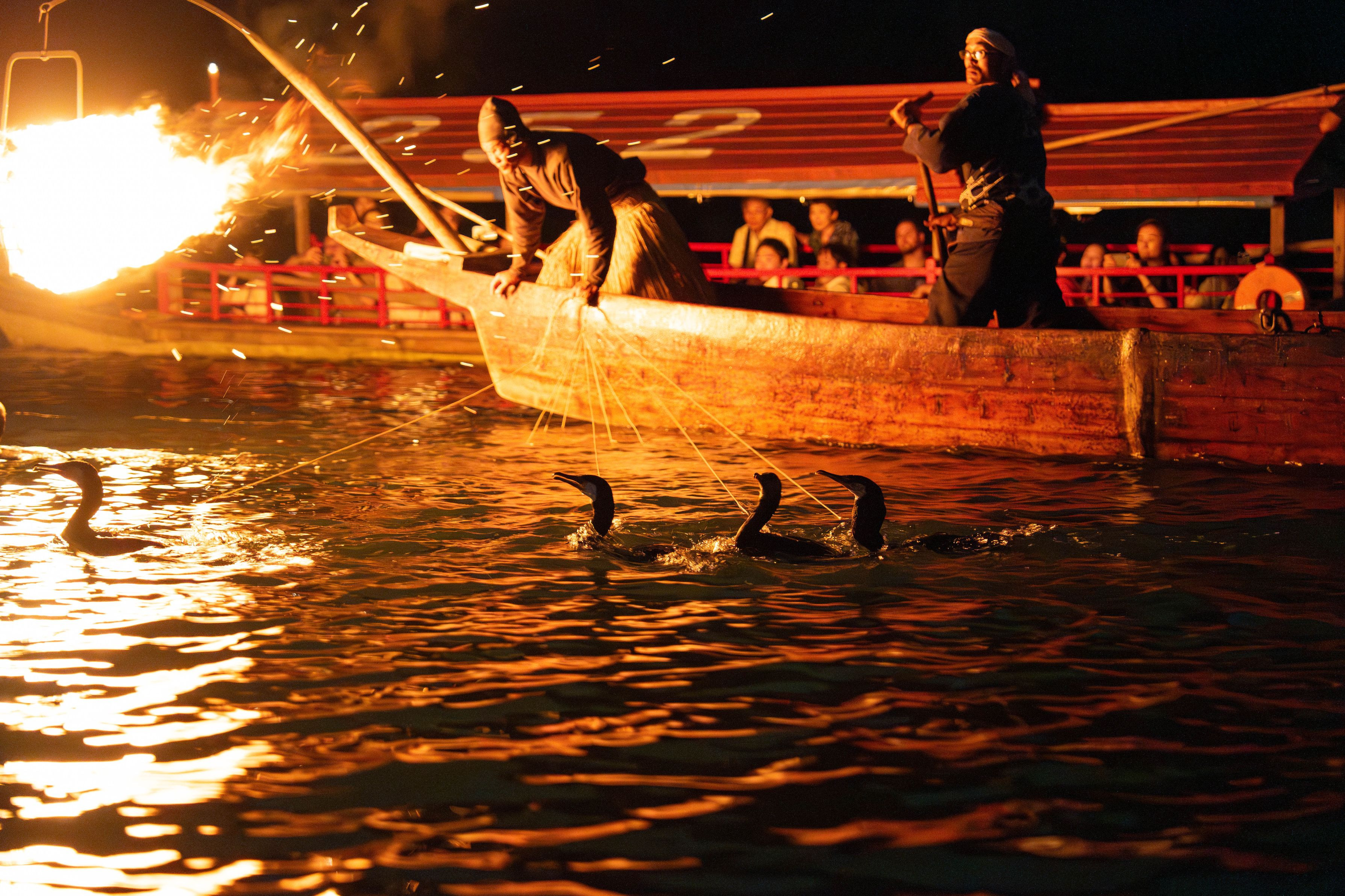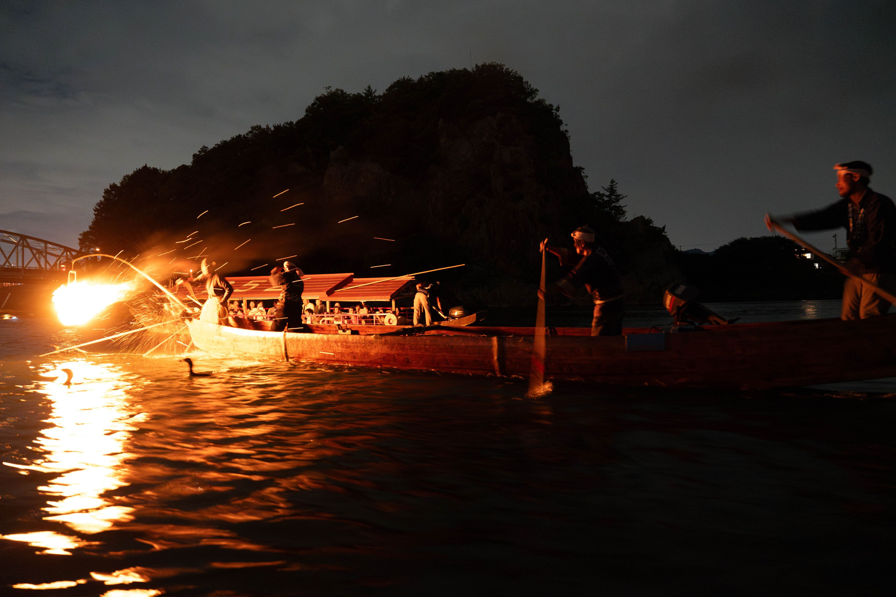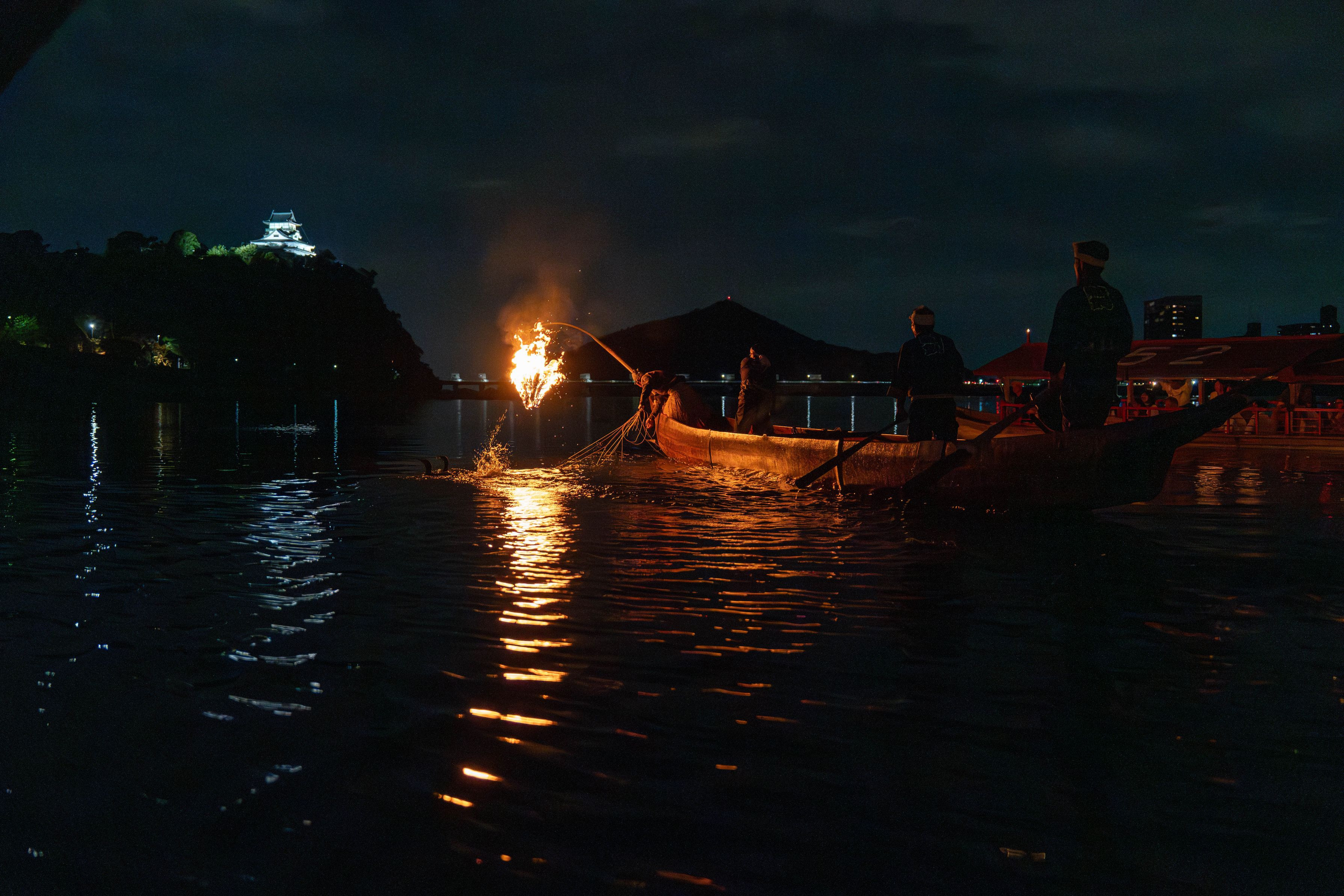 夜の犬山城眺めながら、初めての乗船でしたが迫力満点でした。 夜間で船が揺れるので撮影はなかなか難しかったですが、 1枚目はアユを吐き出す瞬間が撮れていました。
