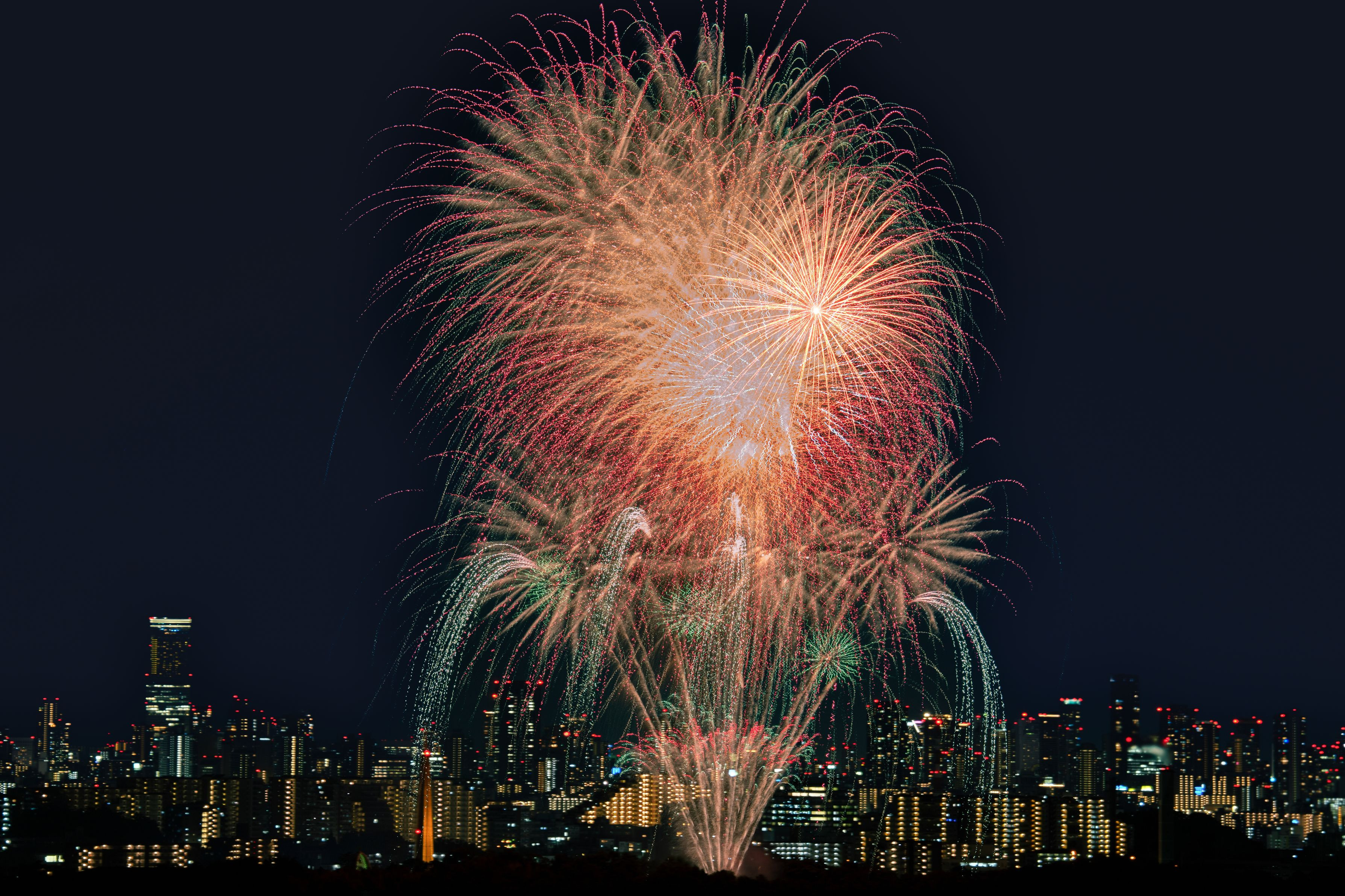 毎年8月8日に茨木市の辯天宗冥應寺で茨木辯天花火大会が開催されます。 地元茨木市では『弁天さんの花火』と呼ばれ、夏の風物詩として長年親しまれています。 少し離れた高台から眺めると遠くあべのハルカスまで展望でき、北摂地域から大阪市の高層ビル群を背景に迫力ある花火を楽しめます。