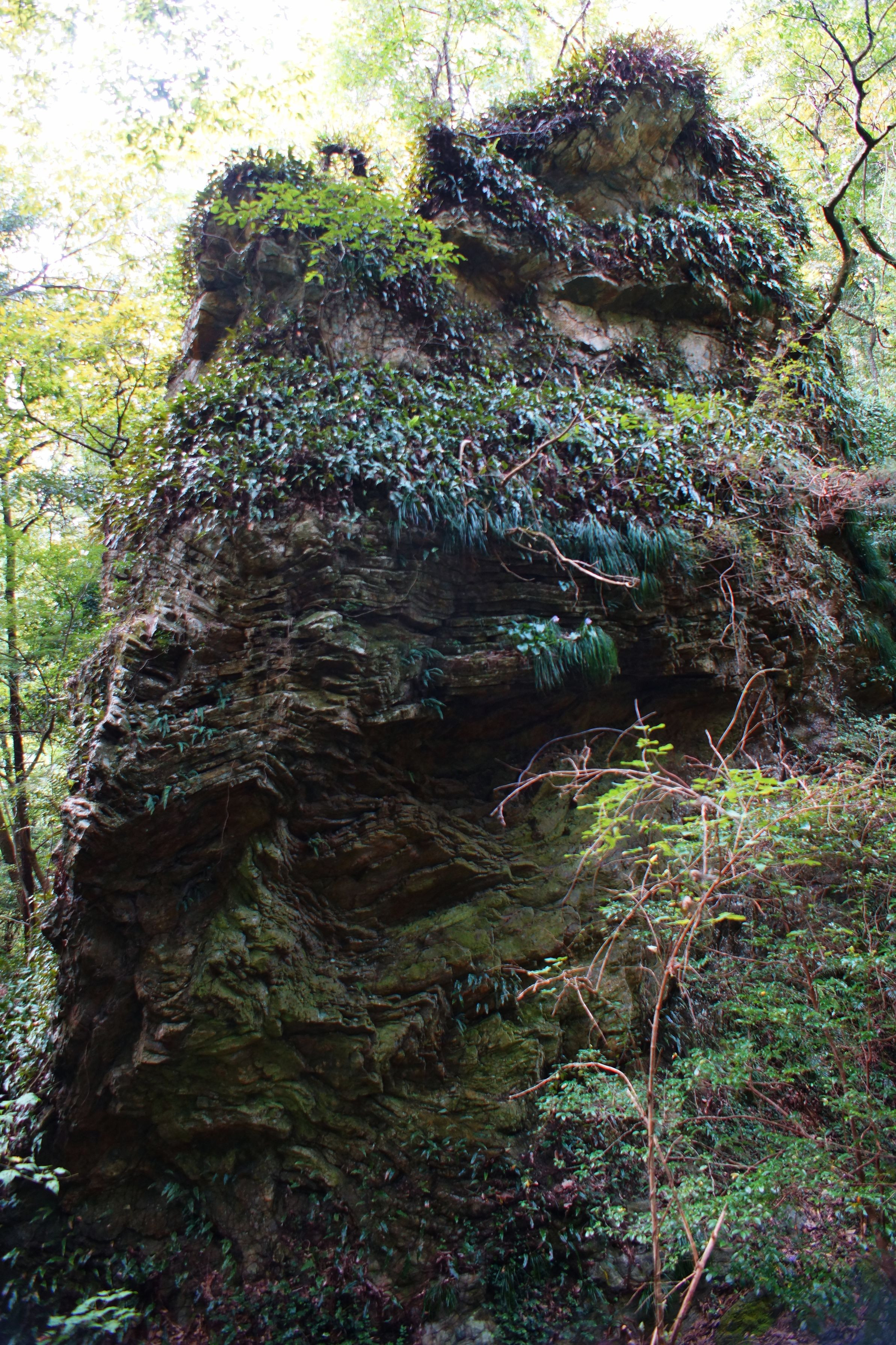 地層重なる岩に生える植物の逞しさ