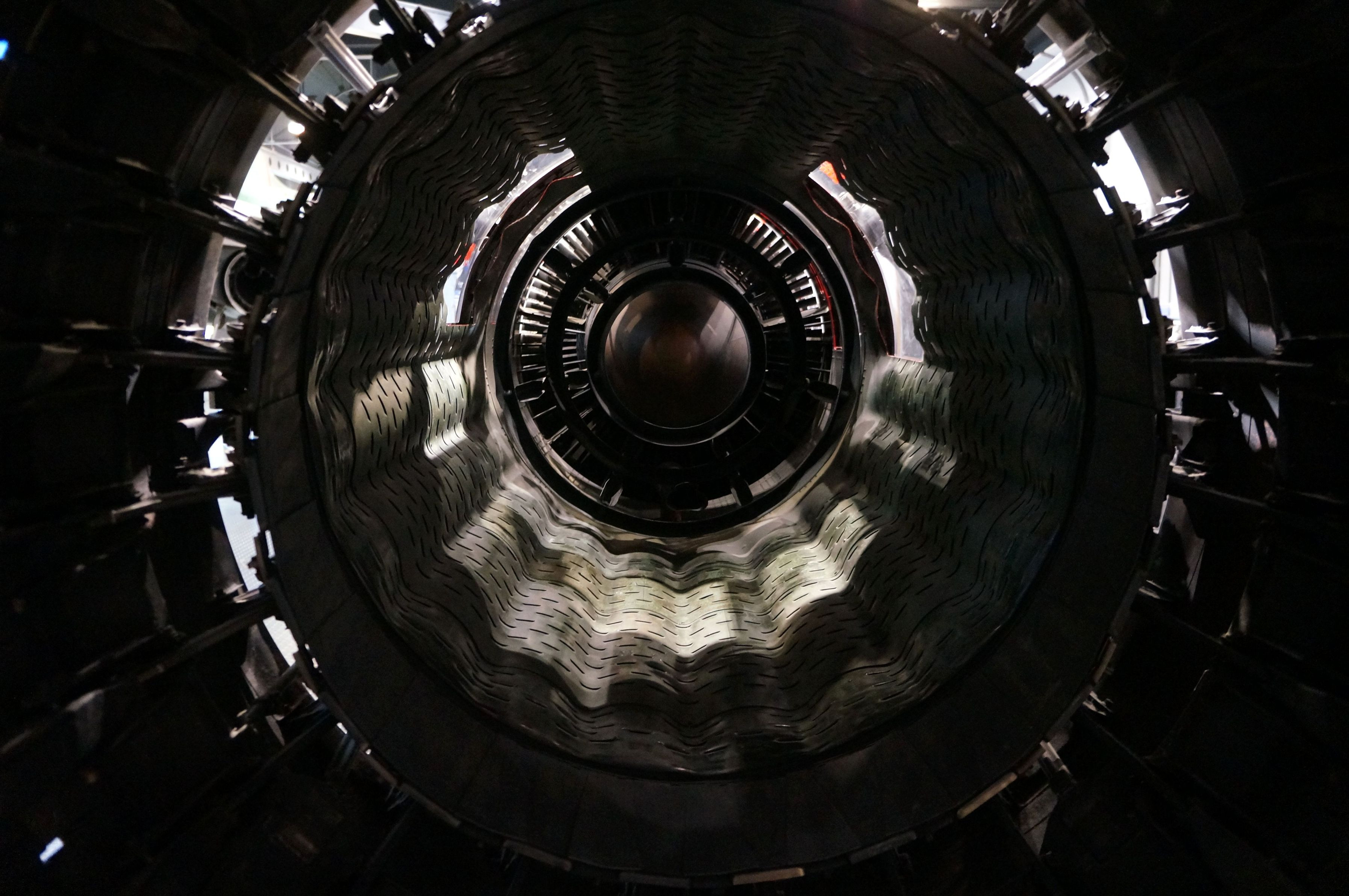 これはジェットエンジンの中を後部から覗いたものです。