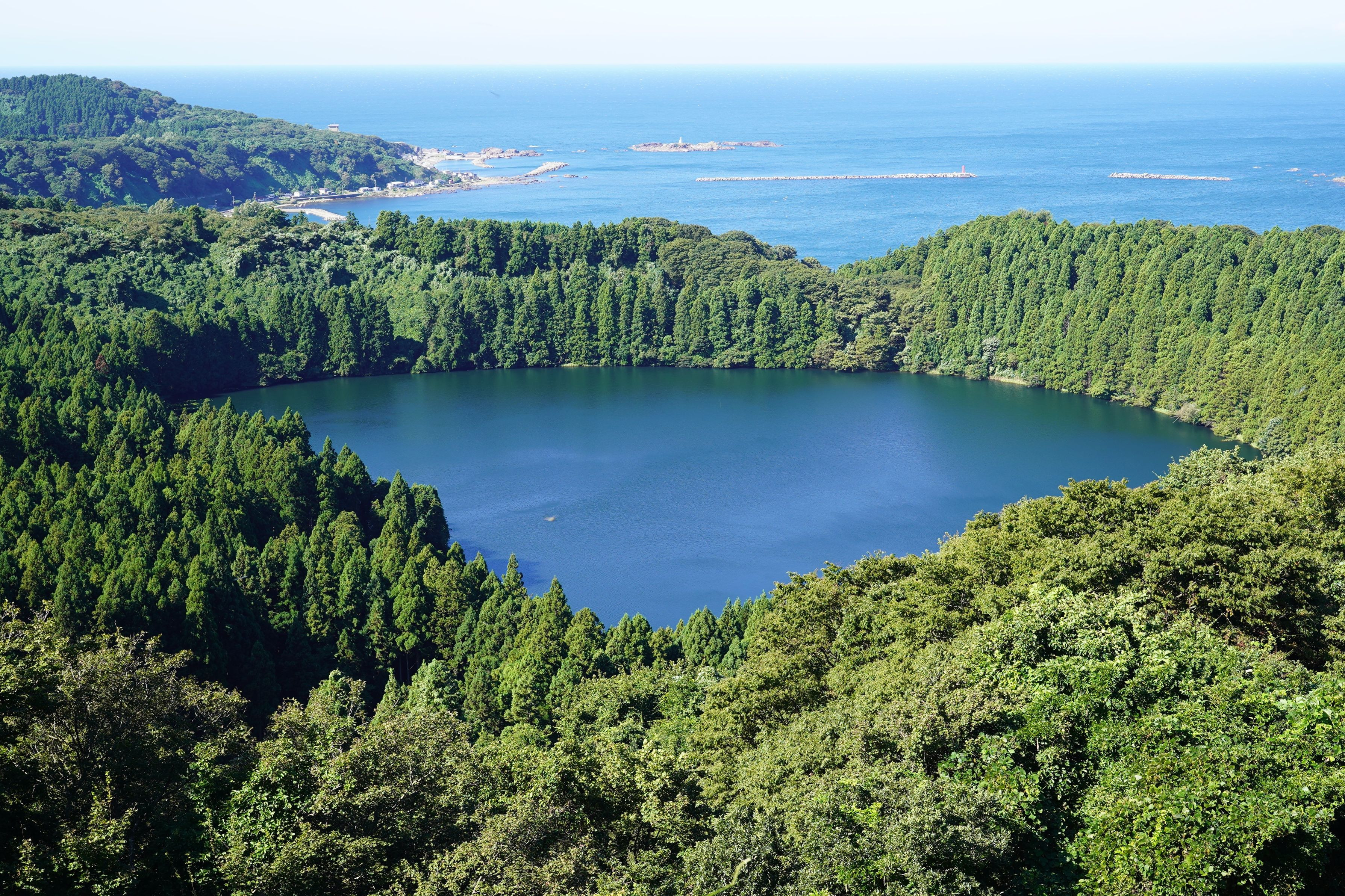 男鹿半島の二ノ目潟です。 とても神秘的に見えました。 マールは水とマグマが接触して起こるマグマ水蒸気爆発によって生じる円形の火口です。 付近には一ノ目潟・三ノ目潟もあります。