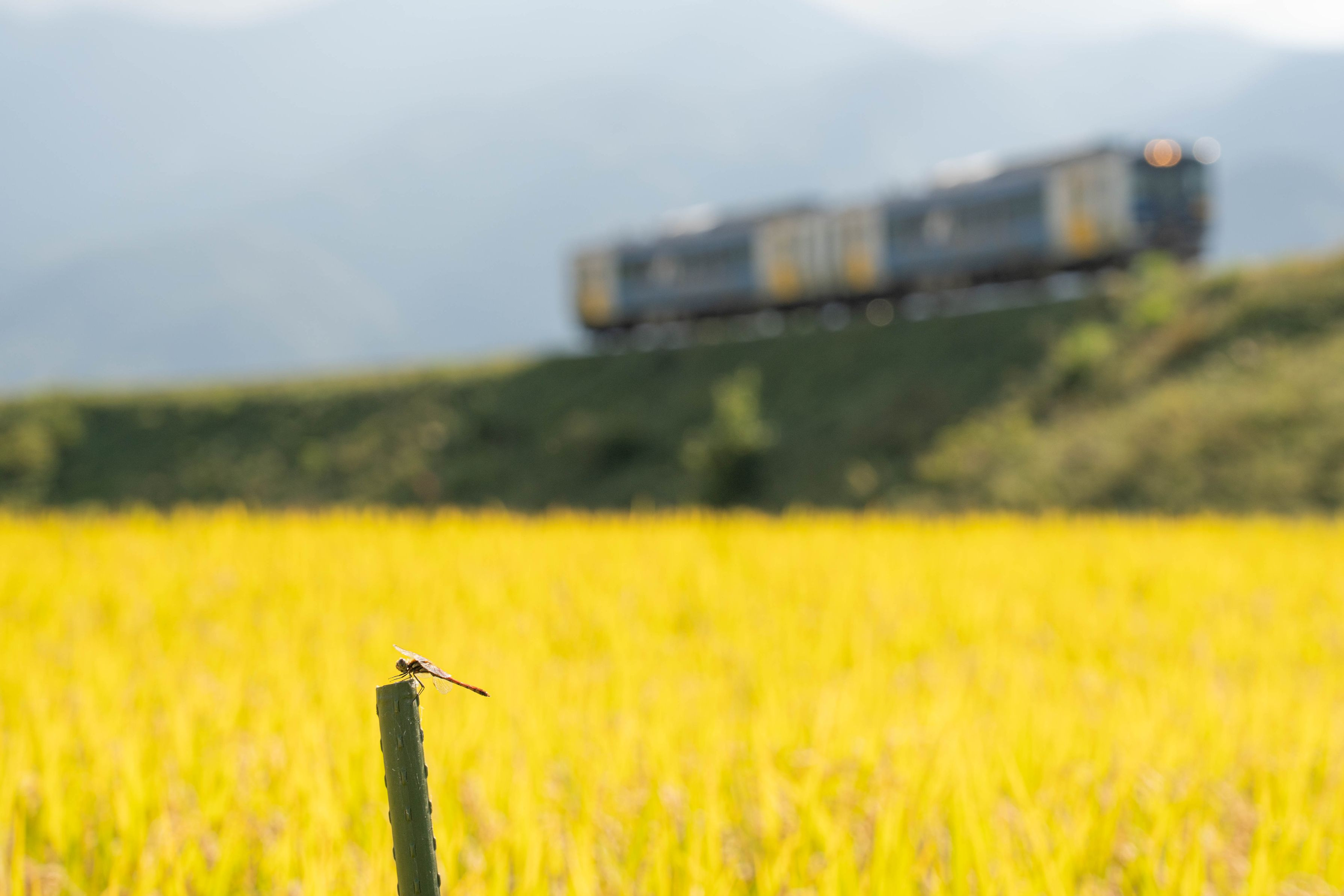 黄金色の稲穂の中を過ぎゆく列車。私の目線は自然と手前の止まり木にとまったトンボに向いていました。