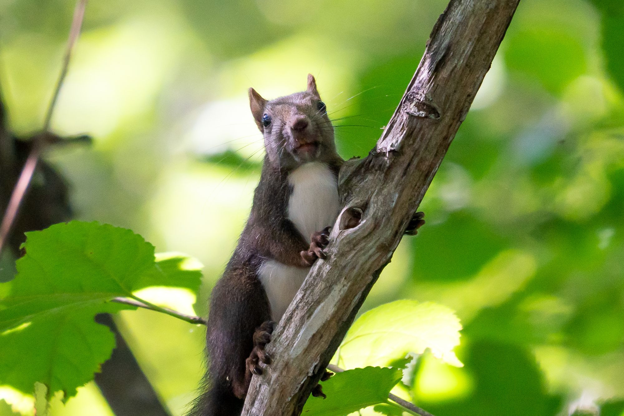 威嚇の声を出すわけでもなく、逃げつつも立ち止まり、こちらを観察しているエゾリスさん。 こちらは撮影をしたくて野生動物などを探して観察していますが、人間もまた、野生動物たちから観察されているのでしょうね。