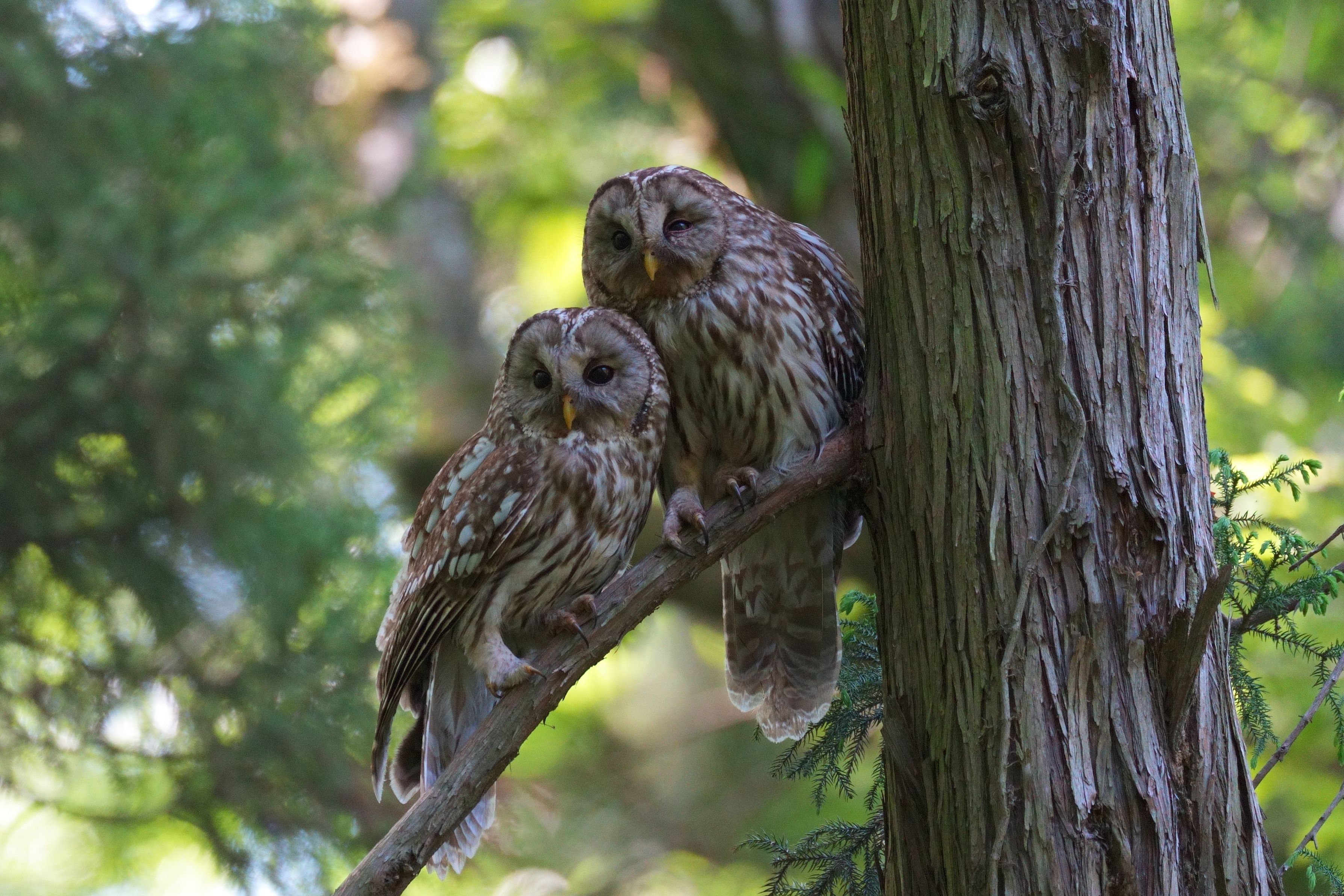 子育て中のフクロウ夫婦が仲睦まじい姿を見せてくれました。