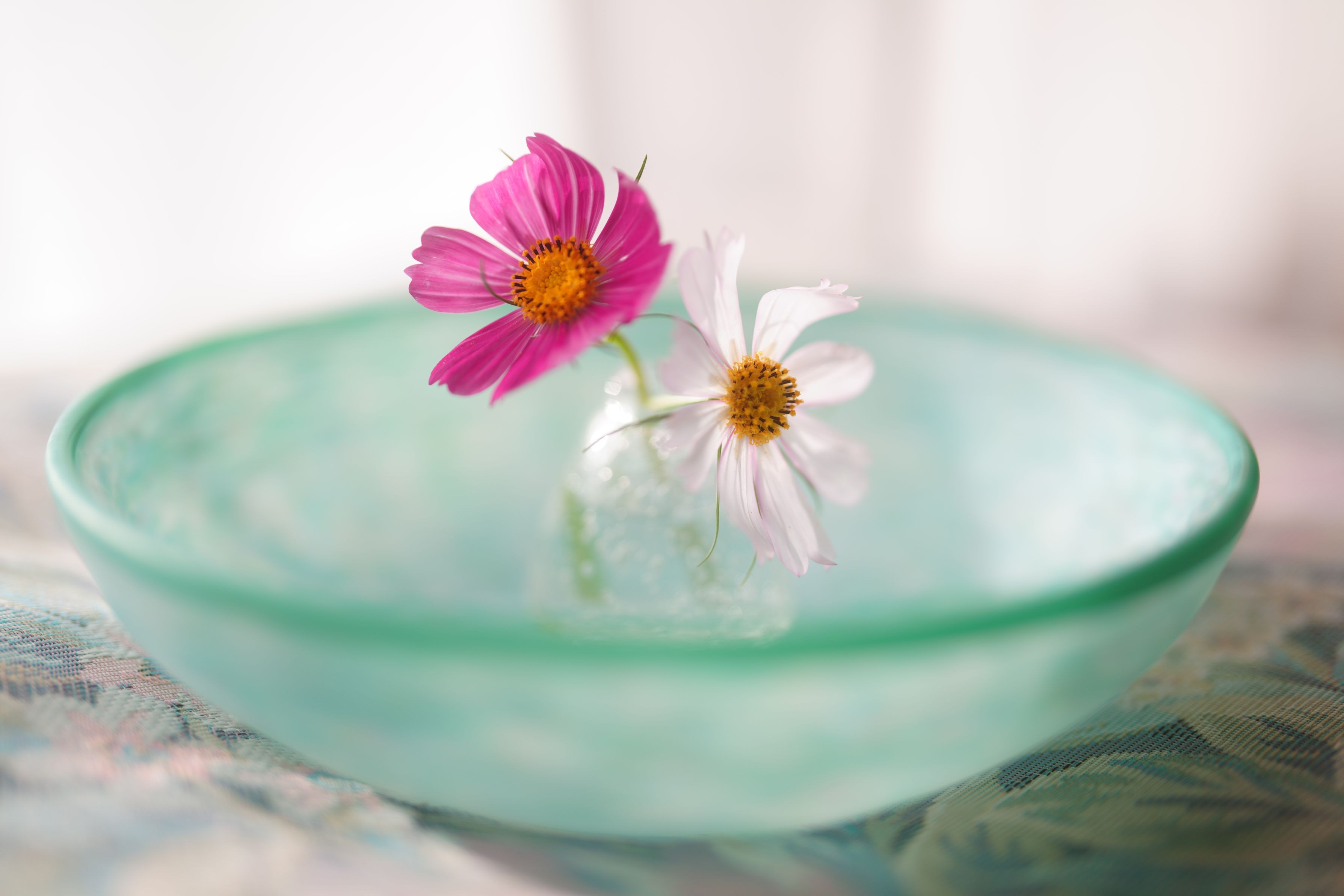 去年の写真です。 秋の入口に路上でコスモスが売られてました。萎れそうで、投げ売り状態だったので 思わず妻と買い占めて、家に連れて帰って活けましたが、二厘だけ生き残りました。 窓ガラスとカーテンでは太陽光を遮る事が出来ないので、トレーシングペーパーとホワイトミストフィルターを使って柔らかくしました。 器は「モネの睡蓮鉢」という作家さん作の逸品です。#カレンダー2025#