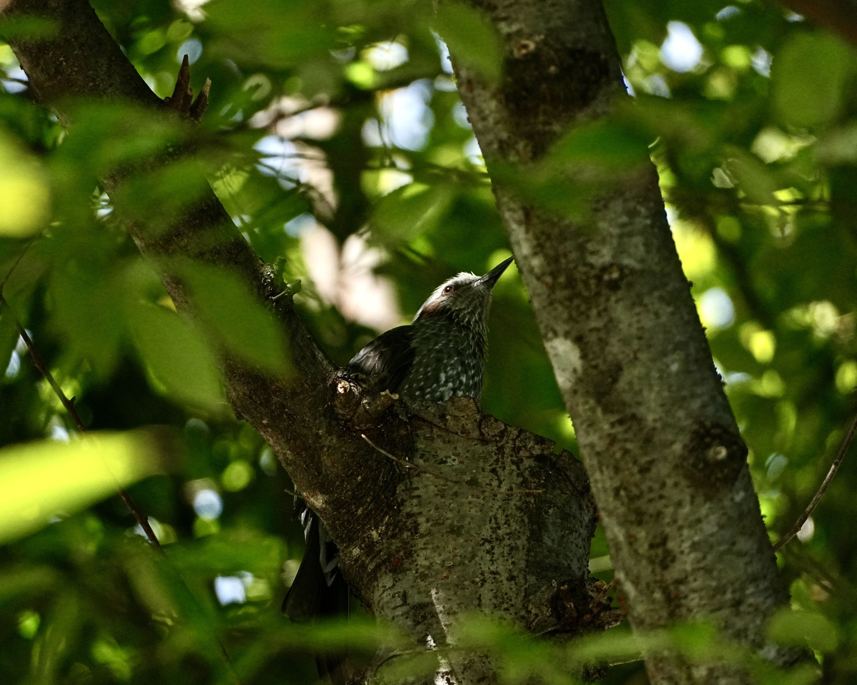 木の中で休んでいるヒヨドリを見つけて撮影。 木漏れ日がヒヨドリの表情を照らして綺麗なお目目が輝いていました。