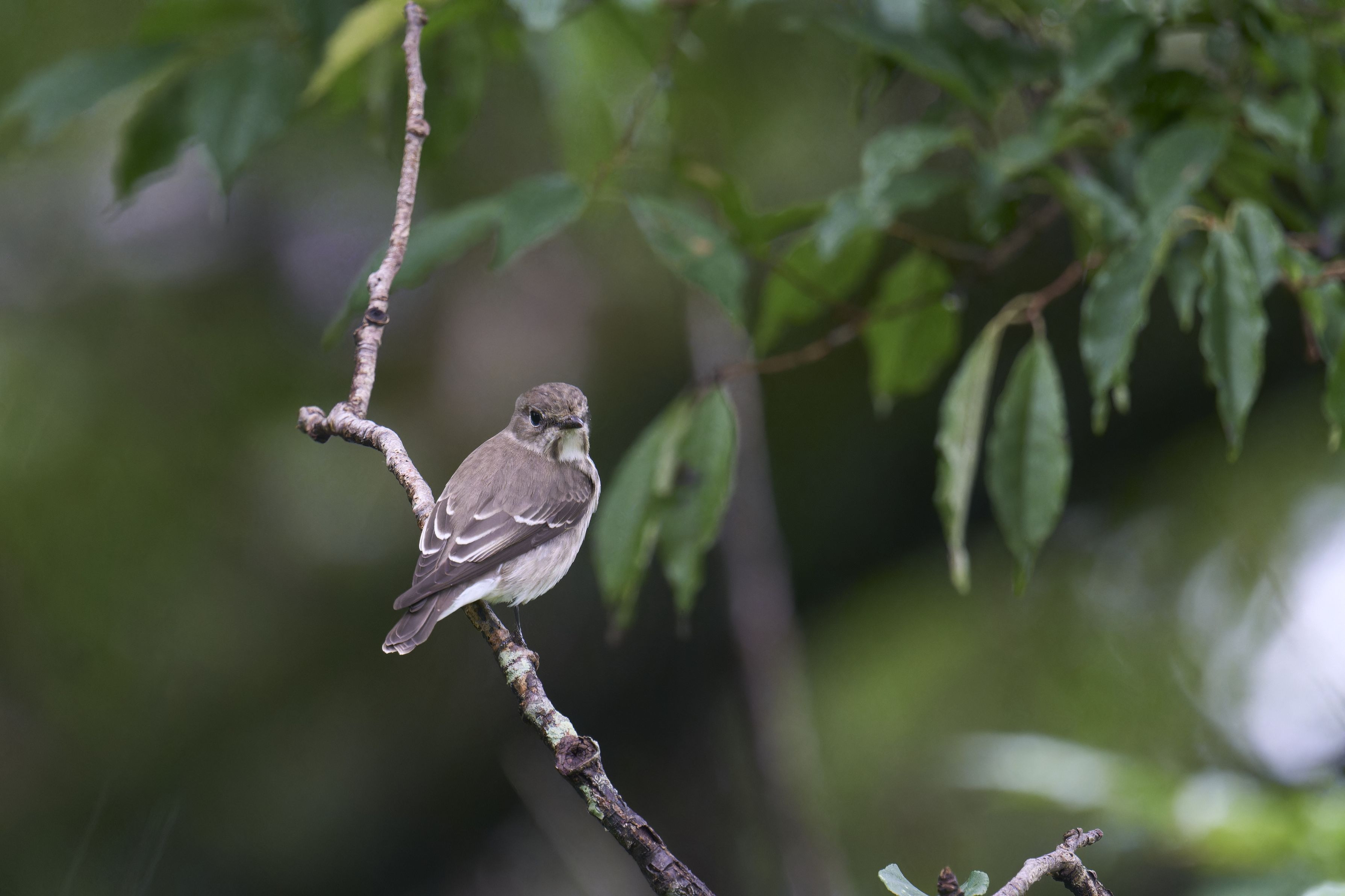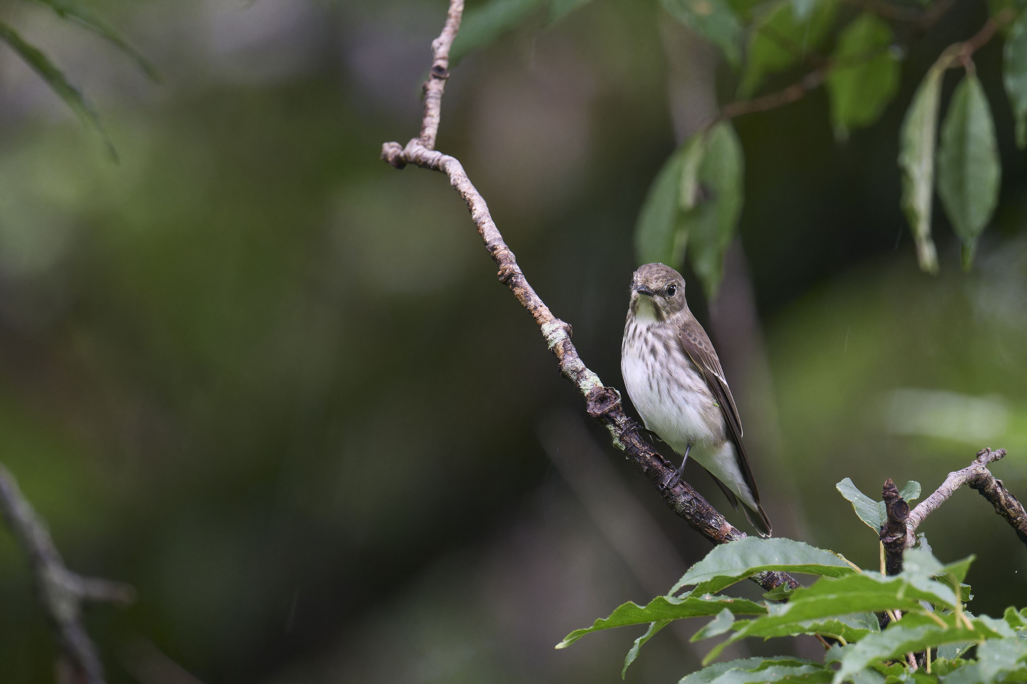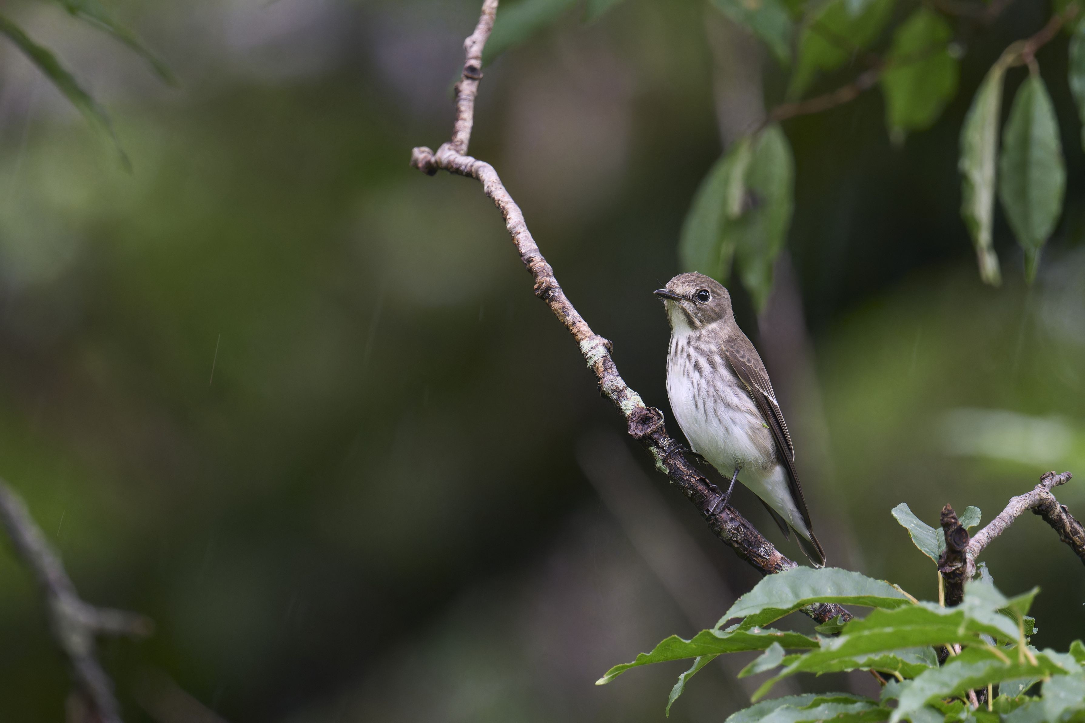 小雨が降るコンディションで、虫たちが地上近くを飛んでいるのを狙って、低い枝に降りてきました。