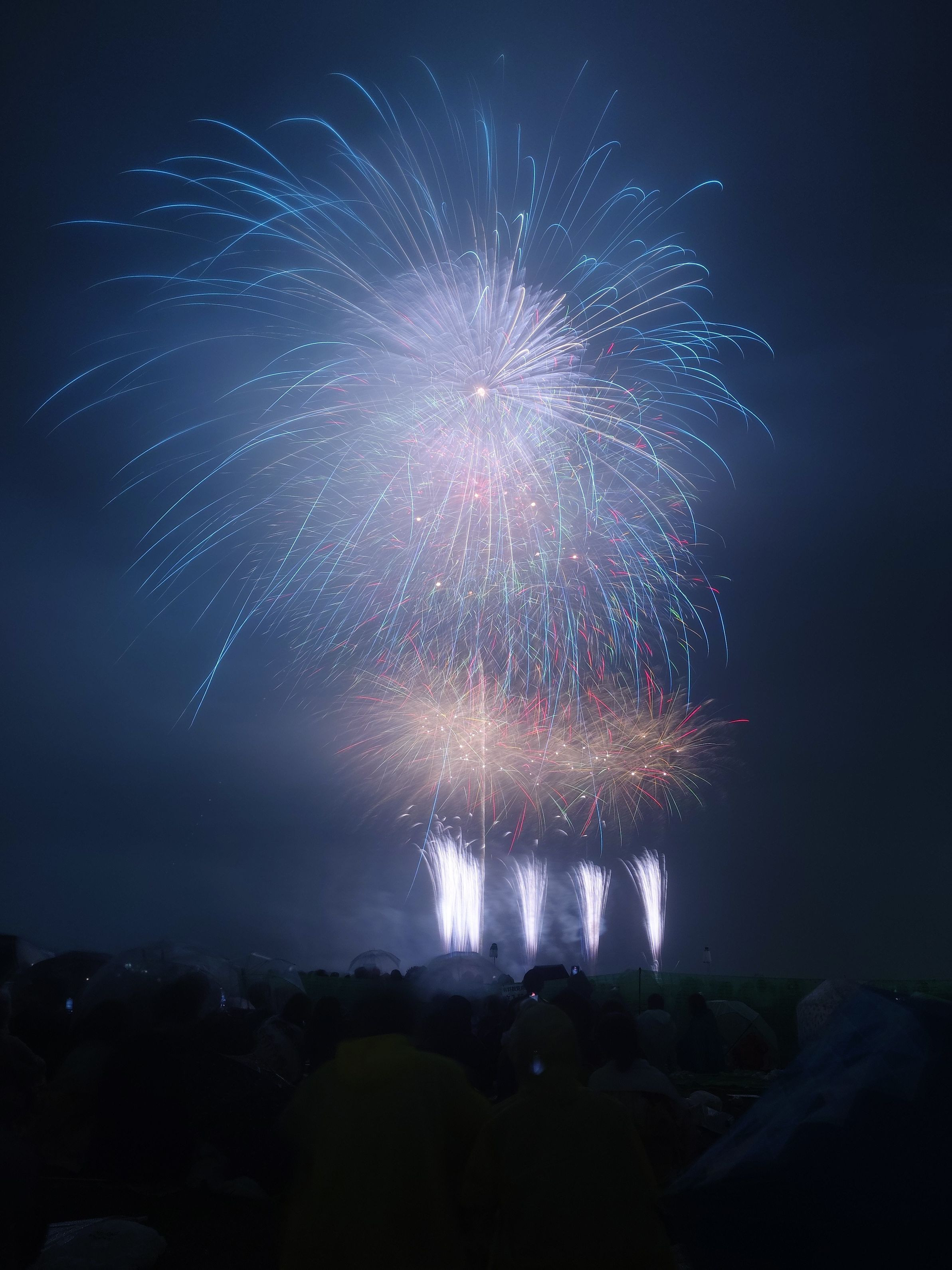 多摩川花火大会2024。秋雨の中華麗に打ち上がる花火。