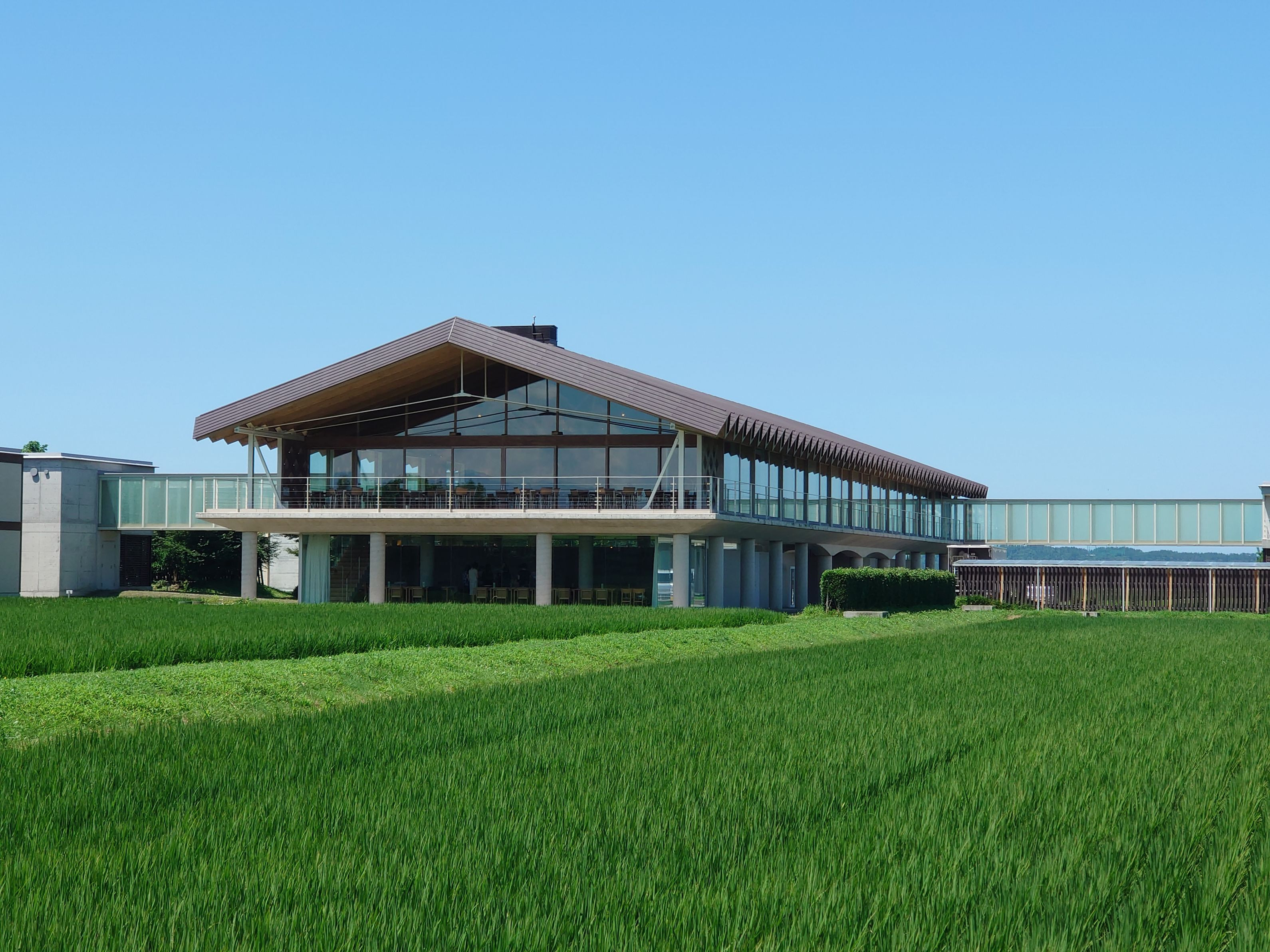 2024年8月初旬に山形県鶴岡市に旅行した時に宿泊した建物をあぜ道から撮った写真です。田んぼの稲の青々しさと空の色、建物のフォルムが綺麗に調和していると思いました。#カレンダー2025#