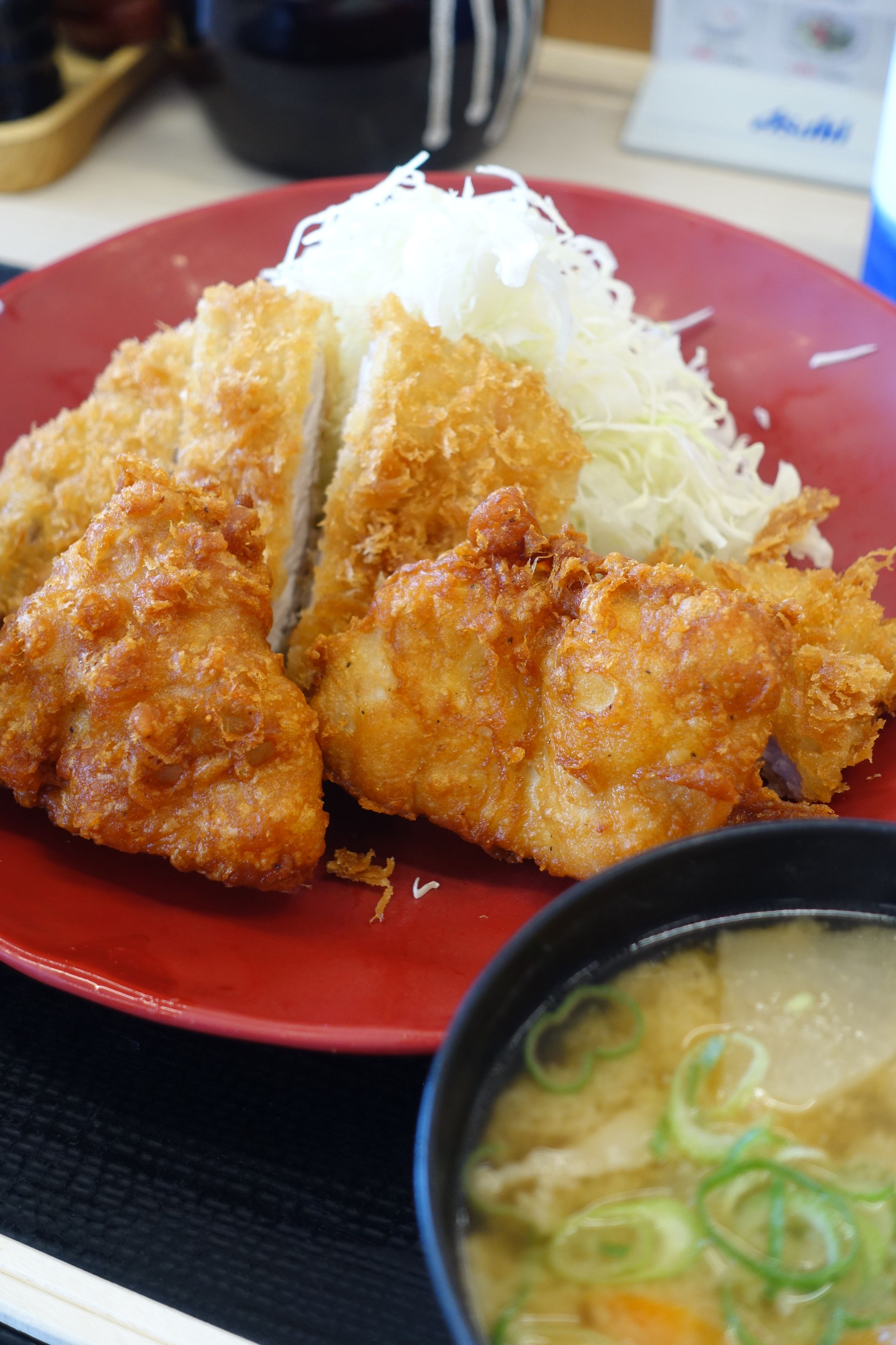 唐揚げとロースカツを盛り合わせた定食を注文。元気をつける為にカロリー気にせず頬張ります!
