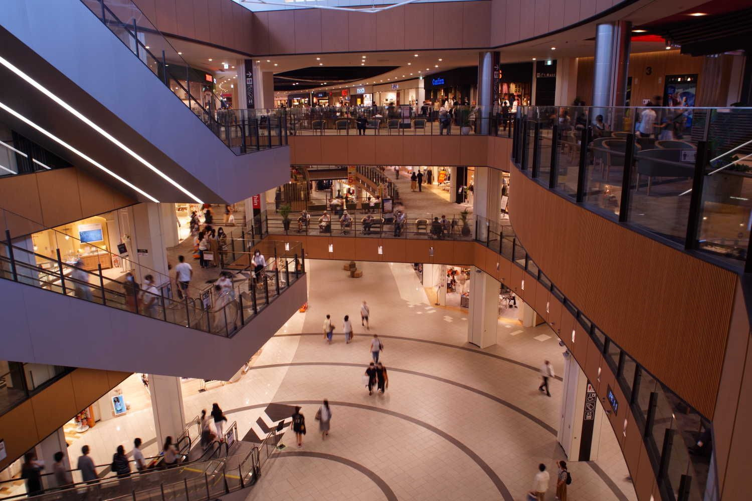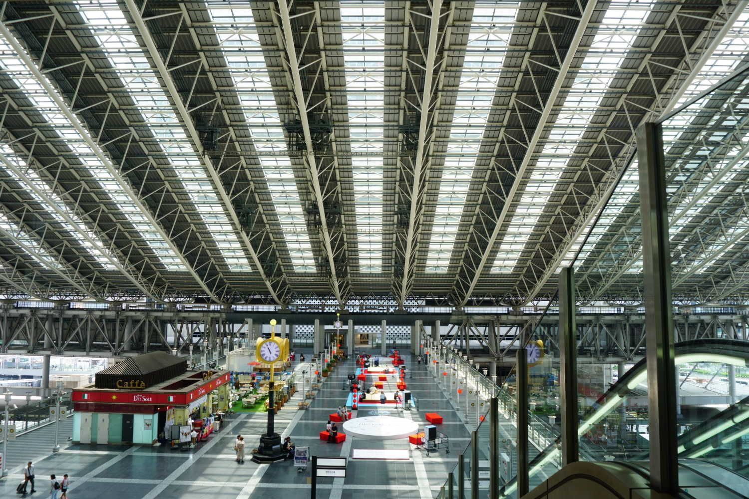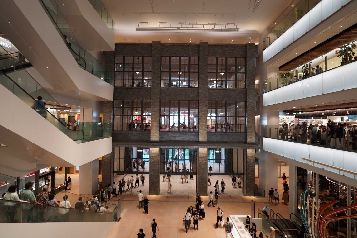 見通しの良い広大な吹き抜け空間 開業間もないからか各階は大変な人出で賑わっていましたが、京都に比べると海外からの旅行者の割合が少ないように感じます