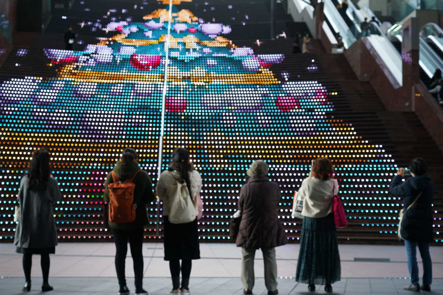 大きなクリスマスツリーのイルミネーションが出現した大階段