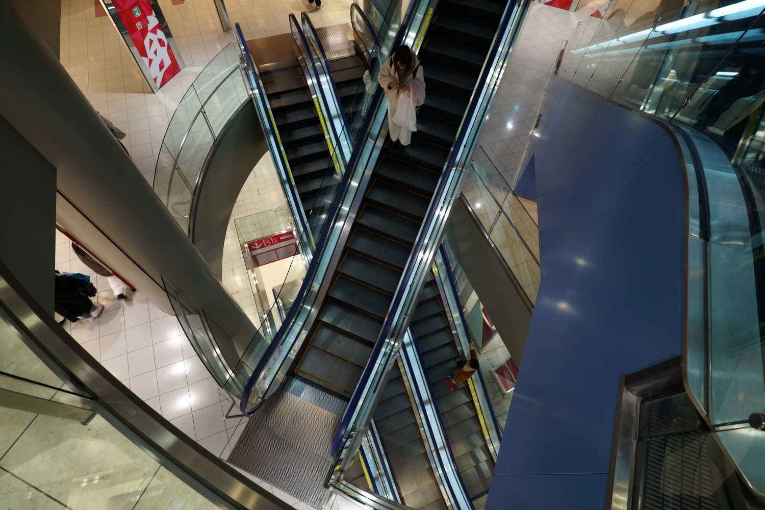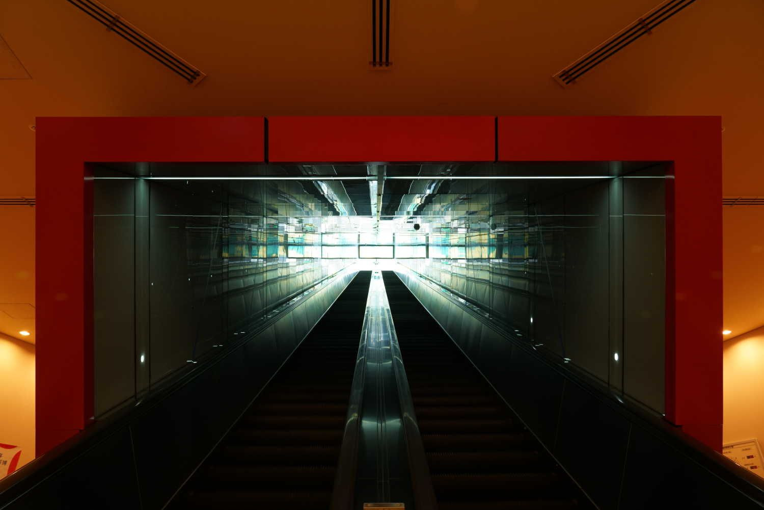 吹き抜け空間を交差しながら上り下りするエレベーターに奈落の底へ導かれるような感覚になりますが、難しくて上手く撮れません