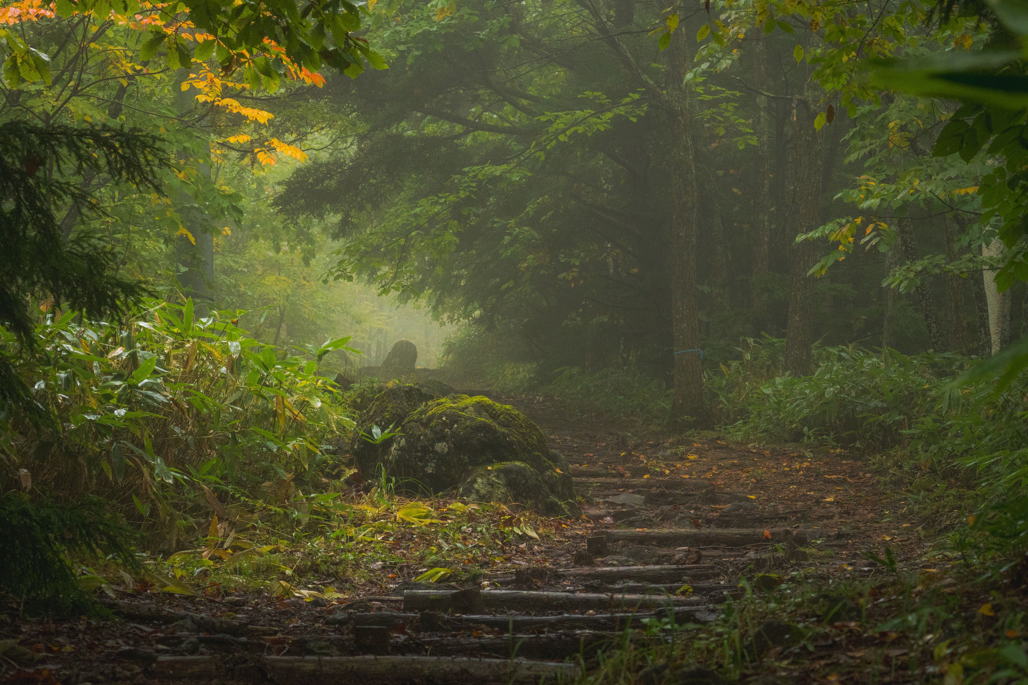 夕刻の山中、霧に覆われた登山道。 なんでもない光景ですがうっすらと射し込んだ光が幻想的でした。