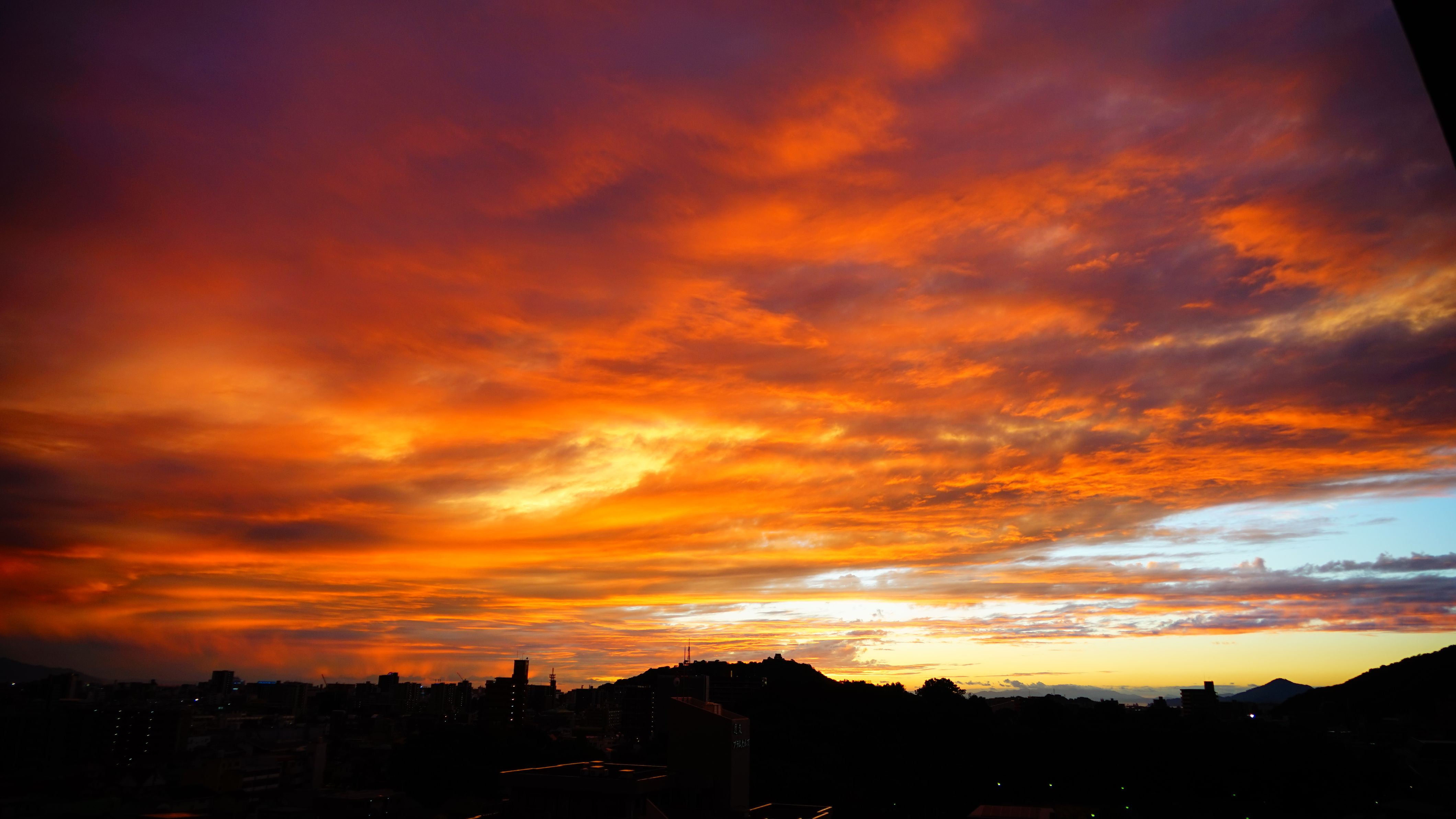 道後温泉へ行った際宿泊したホテルより撮った写真で、あまりにも美しい夕映えの空に釘付けになった。