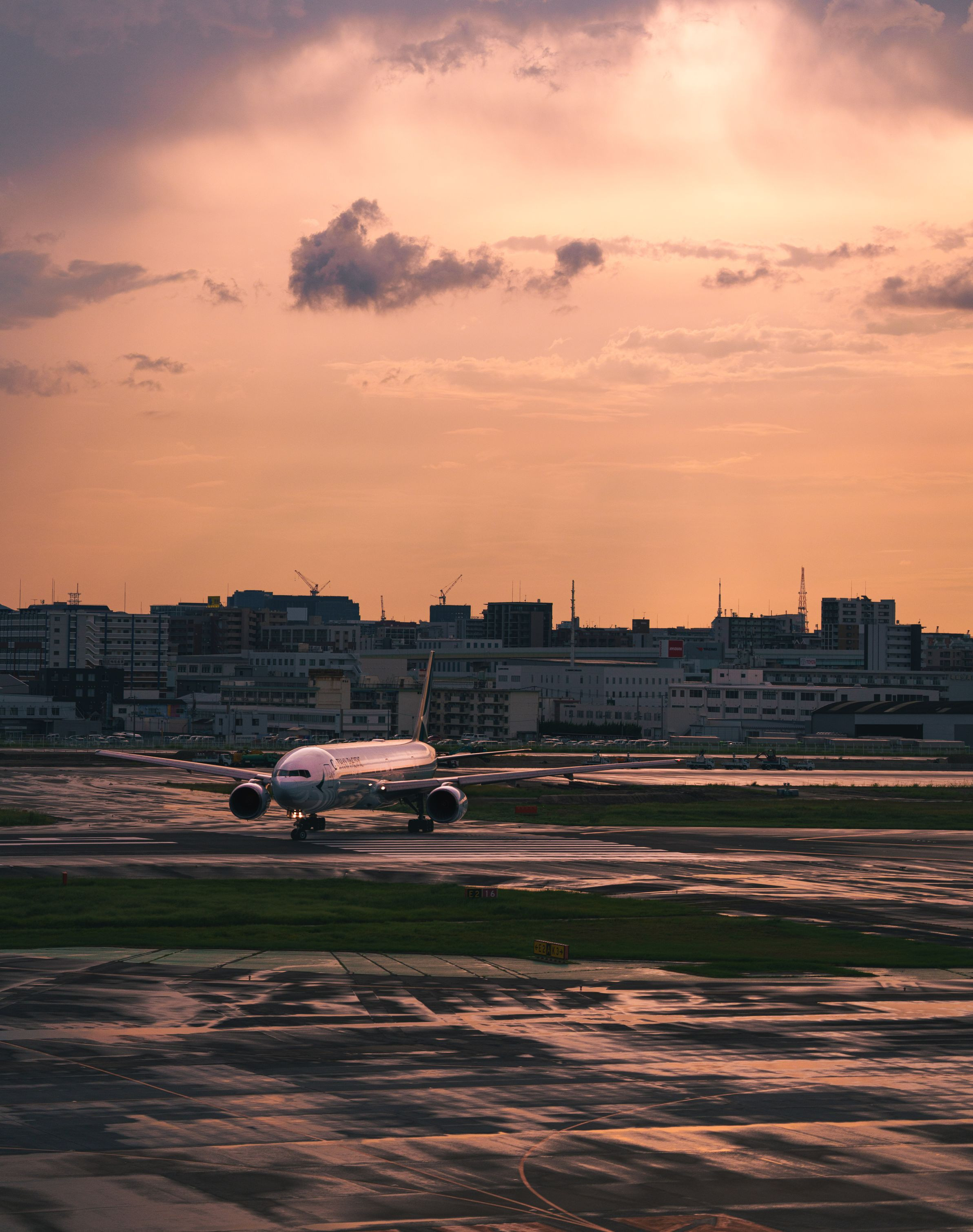 福岡空港にて。雨上がりの夕方。フライトを控えて飛行機が輝いていました。
