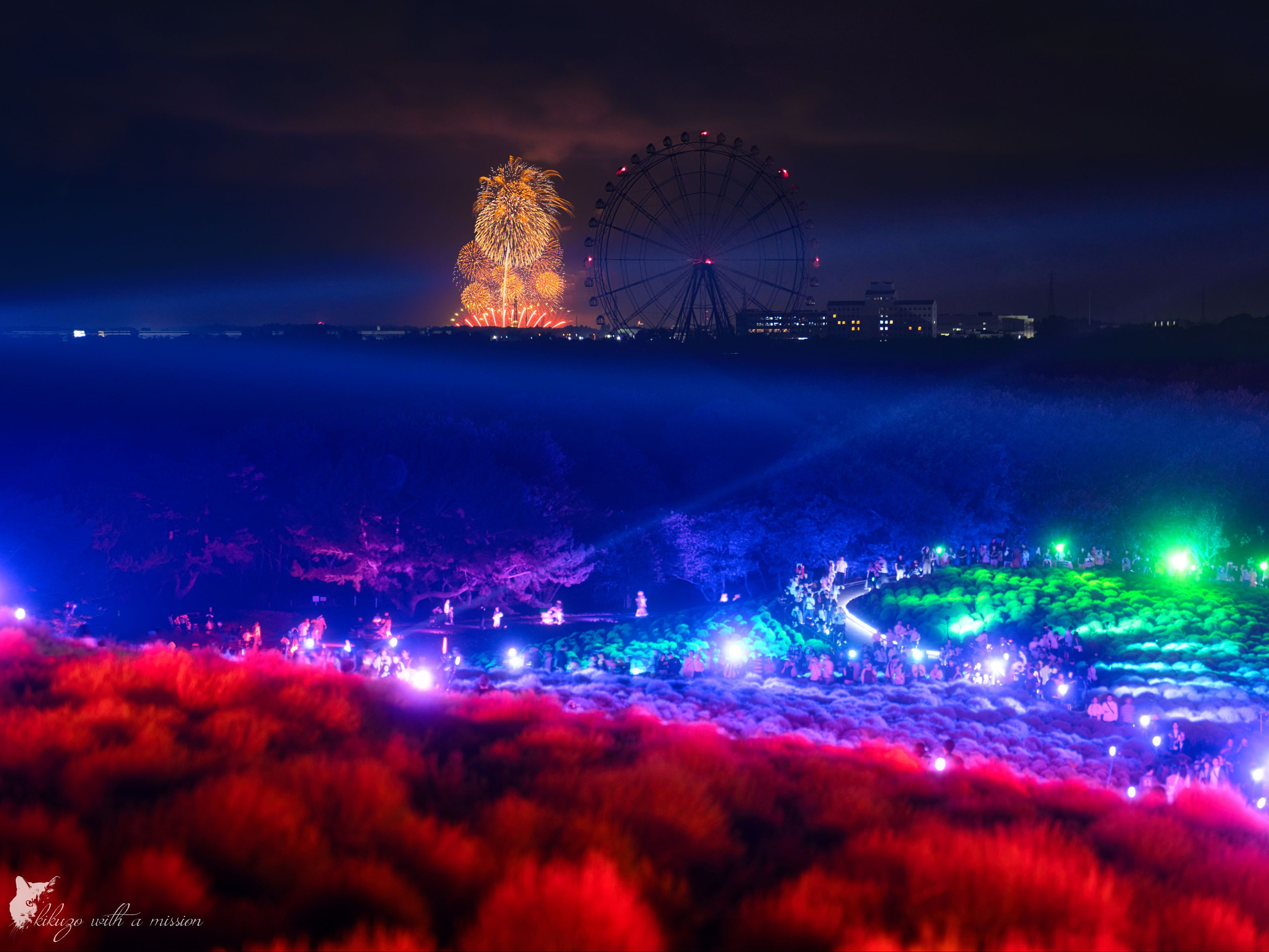 ひたち海浜公園のコキアライトアップを見に行きました。図らずも、大洗の花火大会も見えて、夢のような光景でした。
