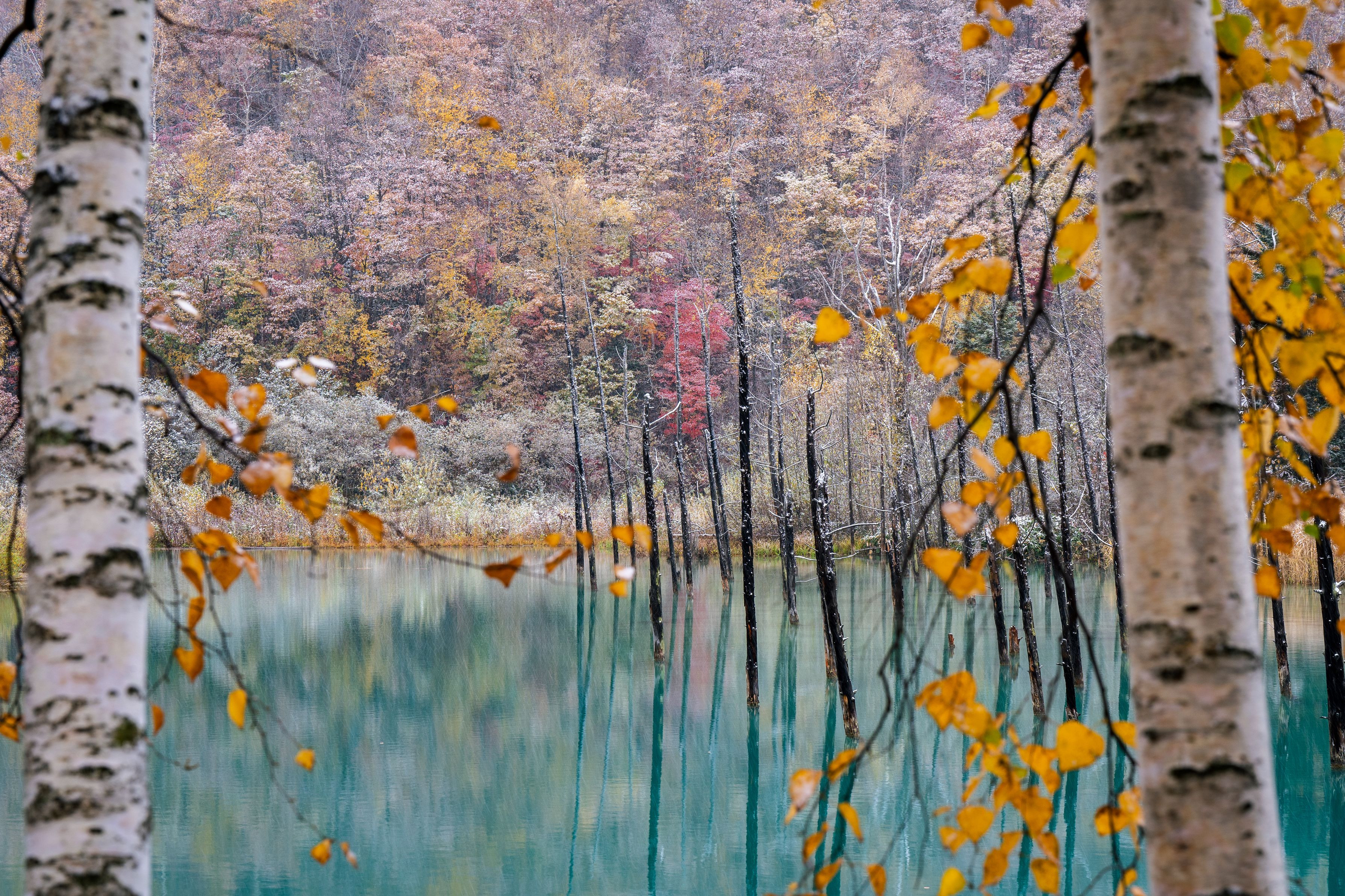 製品情報>My Sony>αcafe>初雪降る青い池の紅葉 #カレンダー2025#(ryoさん)