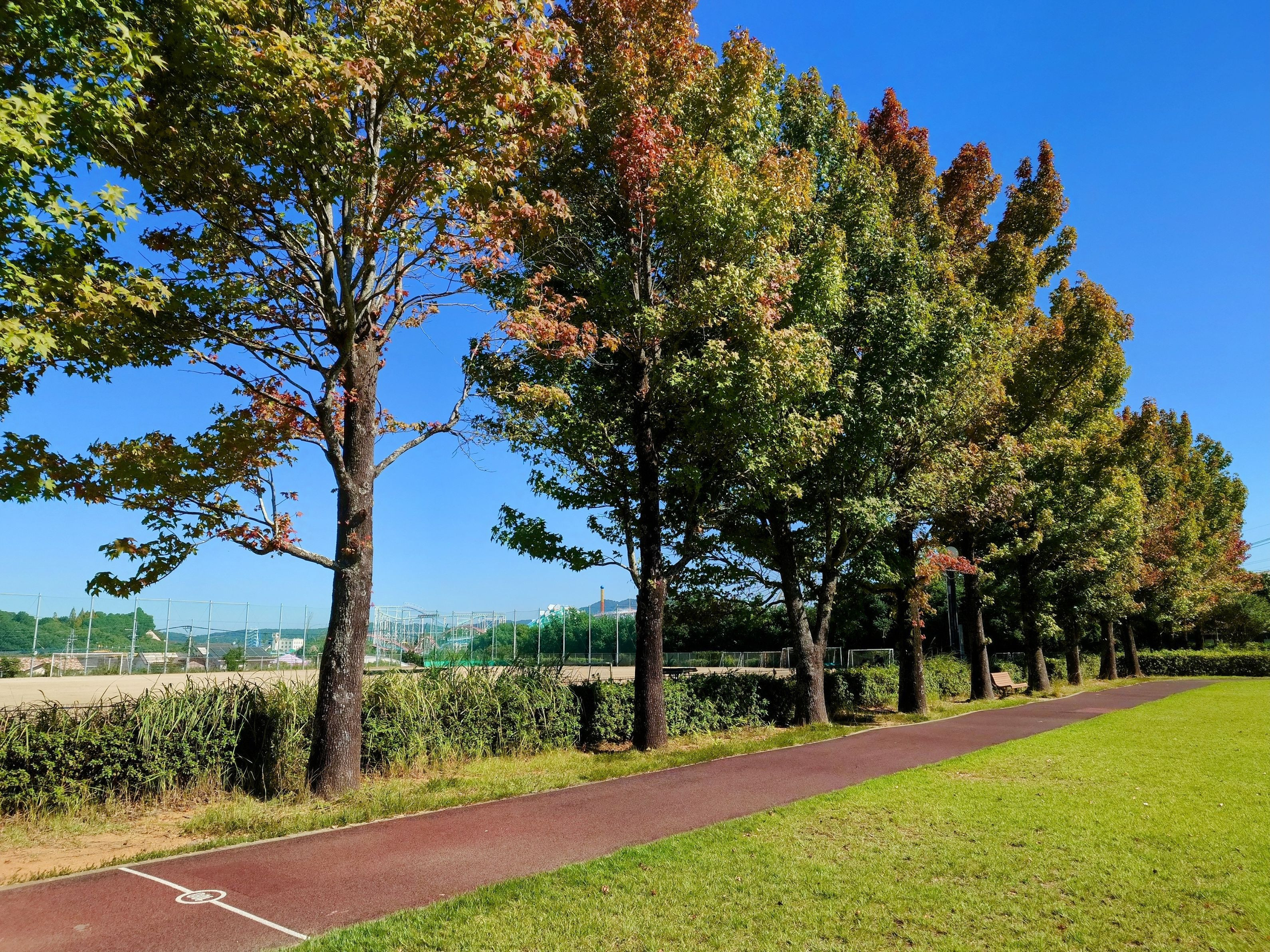 秋晴に映える木々と、背景の遊園地のジェットコースターを1枚に収めてみました。