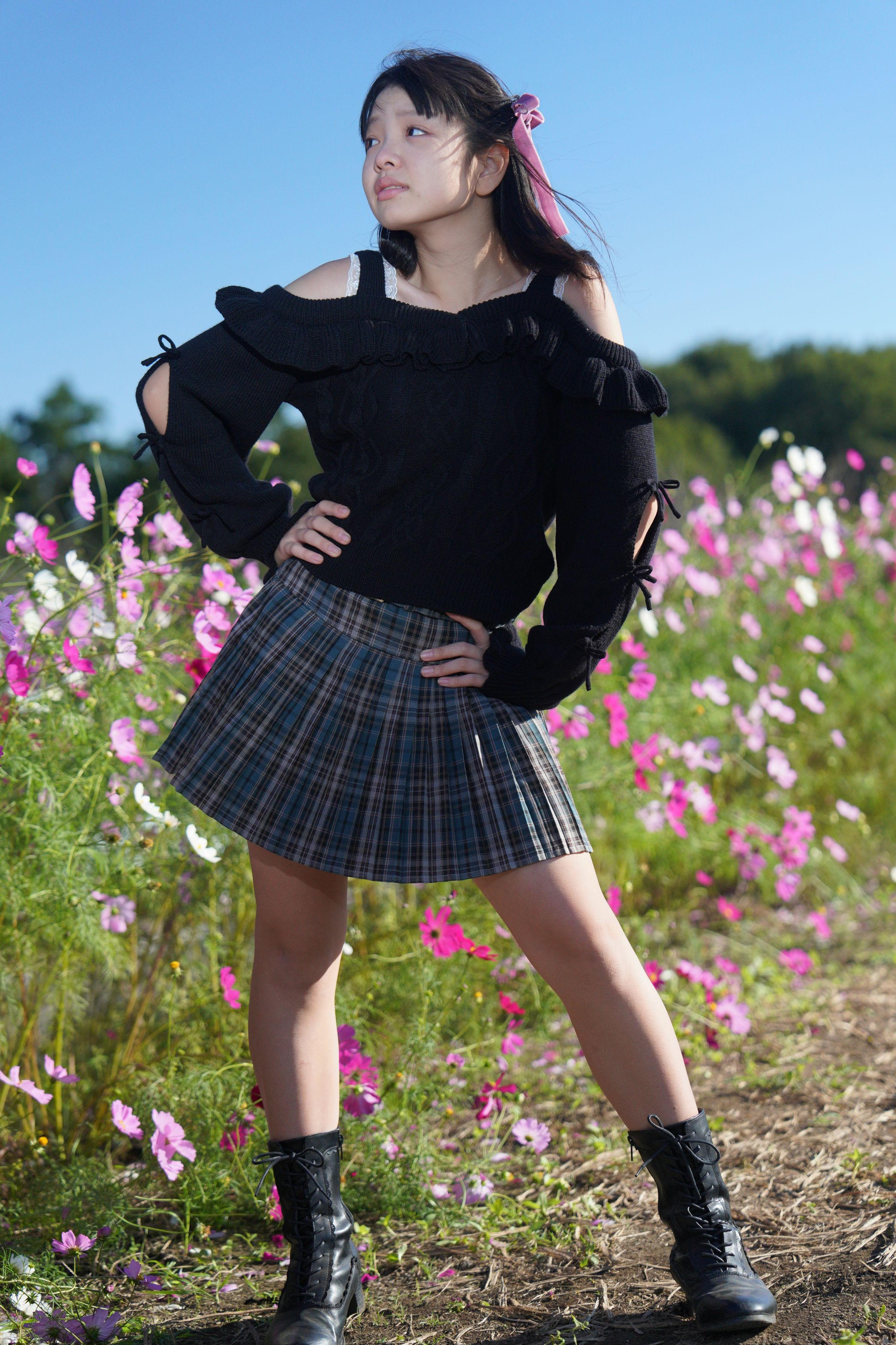 ☆エトワール合同撮影会、コスモスの丘撮影会より:モデルは、虹色キャンデイーガールズ むつみちゃん(中1)です。 この日が、2回目の撮影でした。 なので、始めはちょっと緊張気味でしたが、少しすると、緊張がとけて、笑顔も見られるように、・・・。 それで、コスモスの花が列になって咲く前で、撮ったのが、この1枚。 むつみちゃん、なかなかのモデル上手ではないでしょうか?? 2枚共、撮って出しです。