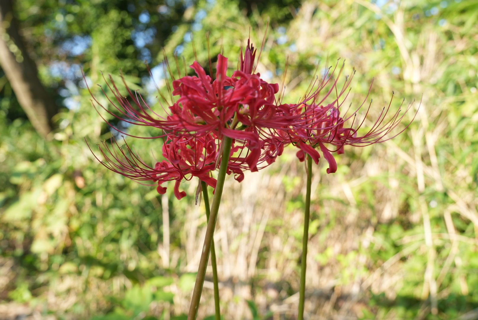 近所を散歩中に見つけた彼岸花です。 周りが緑で囲まれていたため、より朱く際立って咲いているように見えました。