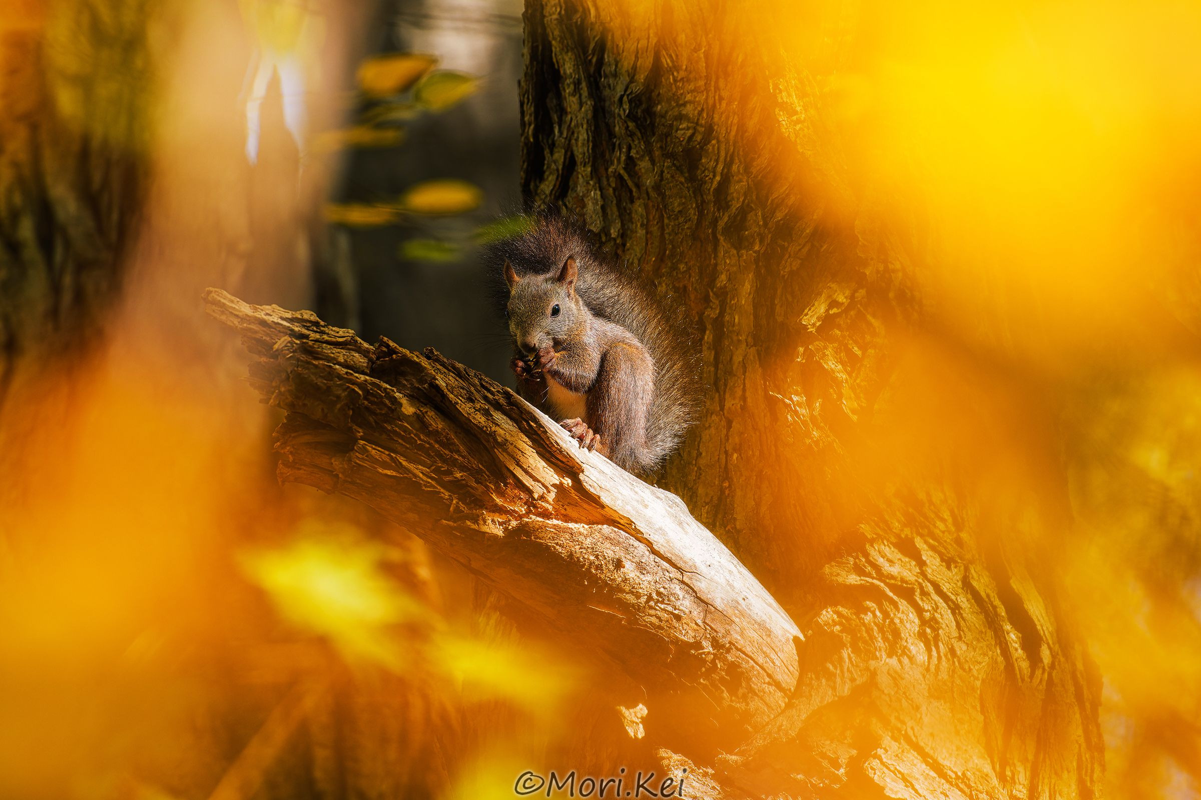 黄葉ボケの中でご飯を食べるエゾリスです