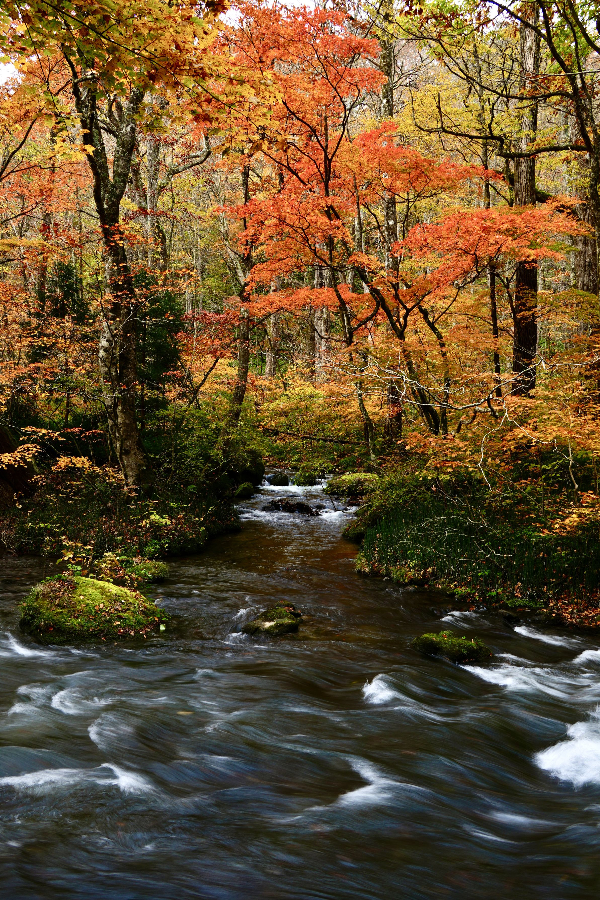 奥入瀬渓流はいろんな撮影スポットがありますが、あまり人がいない場所を撮影してみました。奥から流れてくる渓流と手前の渓流が合流している所と、紅葉のトンネルのようになっている所も気に入りました。
