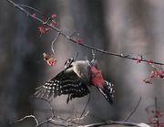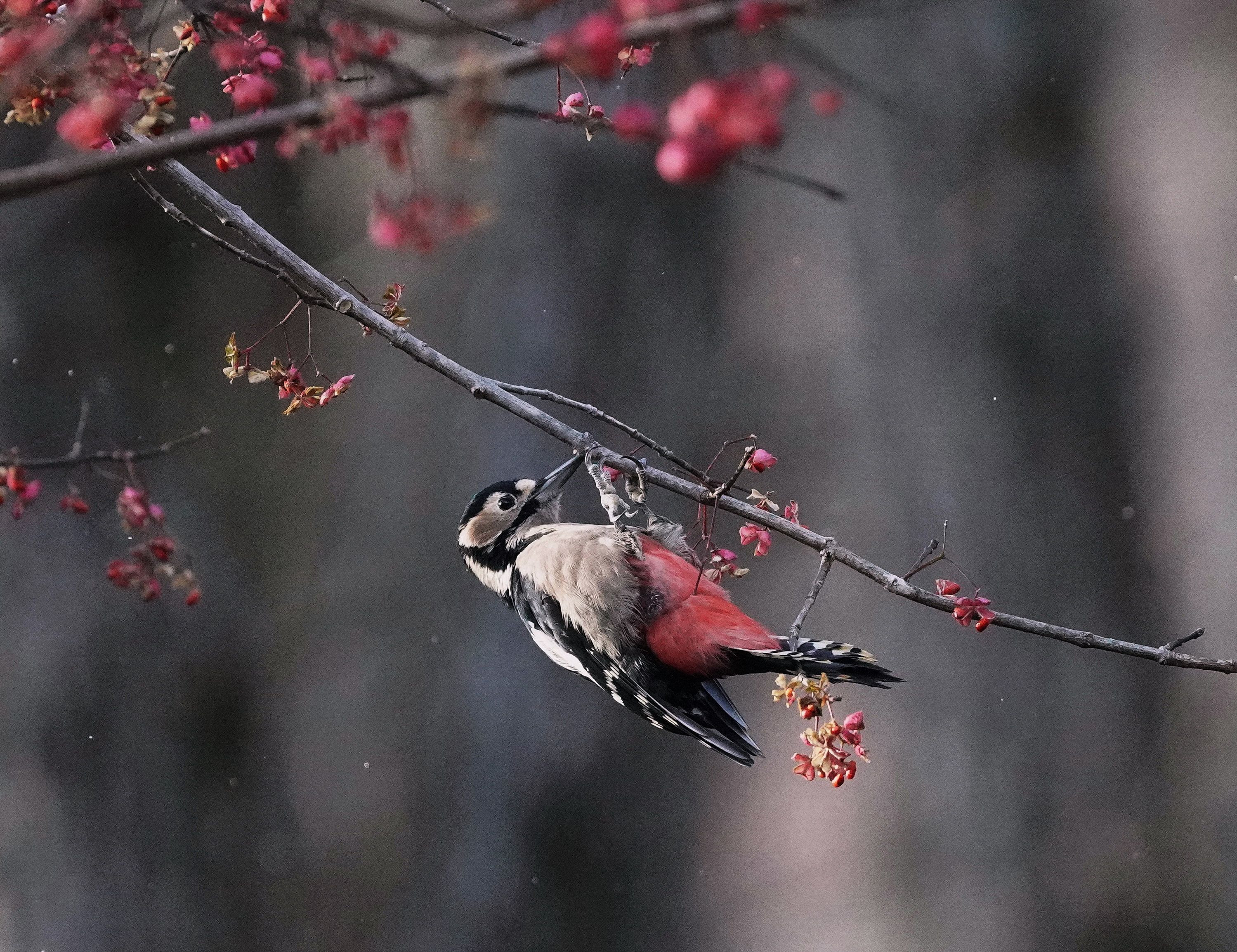 粉雪が舞う中、マユミの残り少ない実を食べに来たアカゲラです。この年も今年も同じにマユミの実付きが良かったのでよく来てました、今年も来てくれるかな?