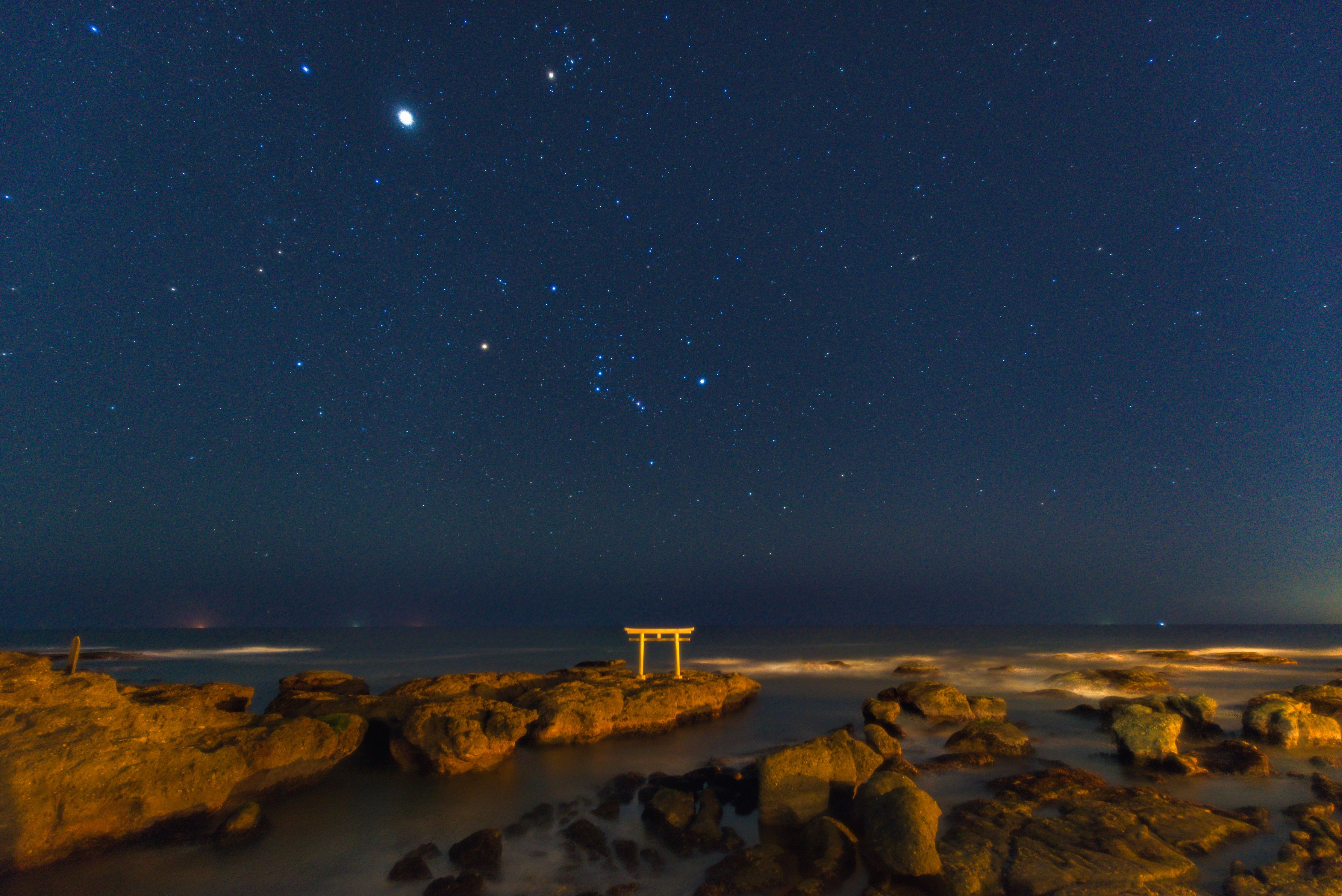 冬の星座オリオン座と大三角が本格的に上がって来ましたね。 天気に恵まれて雲一つ無かったです。大磯の神磯の鳥居は夏天の川以来です。 1枚目シグマ16mmF1.4 DC DN α6700 二枚目タムロン11-20mmF2.8 α6600 プロソフトンA コンポジットあり。