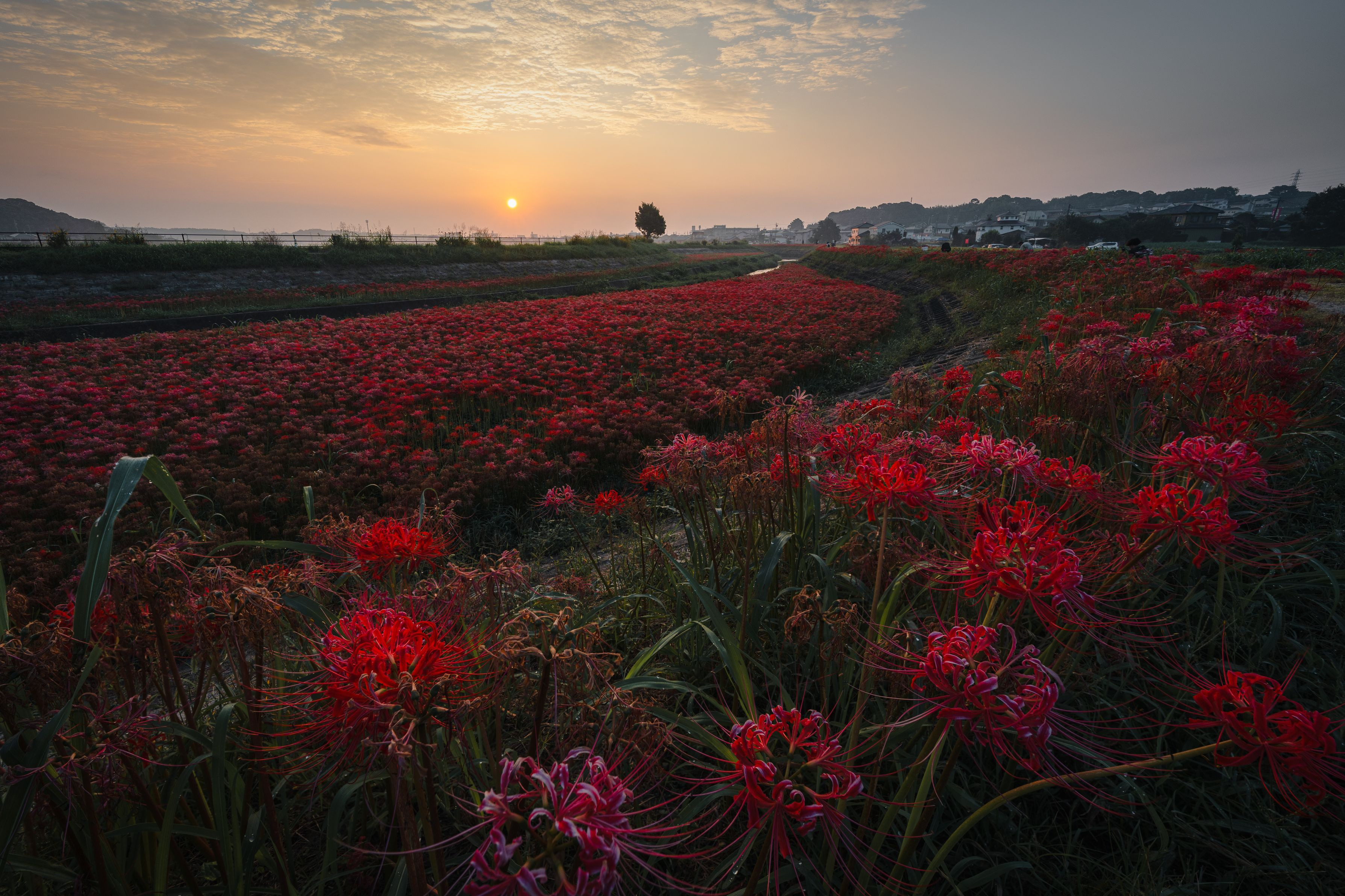 朝日に照らされ赤く輝く彼岸花が最高にきれいでした!