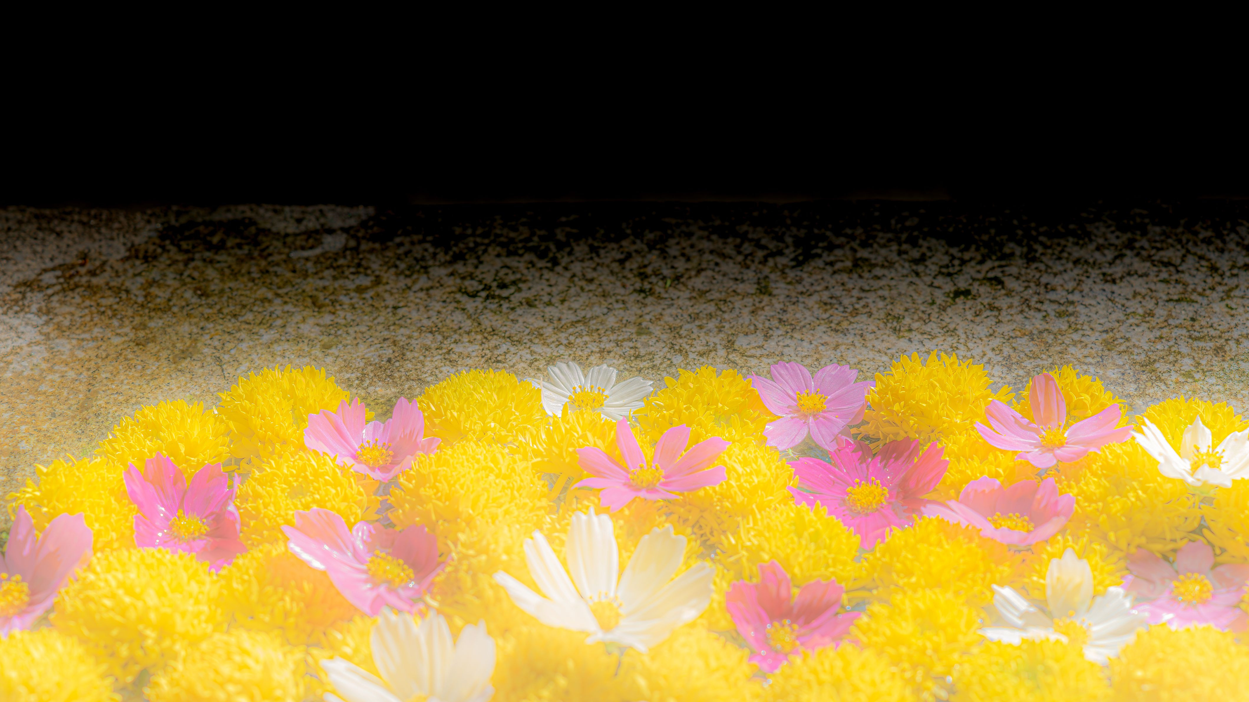 鎮守府の花手水。花の種類は11月とは変わっていないようだった。若干のノイズの軽減ののち16:9にトリミング。奥の水受けの向こう(背景部分)は「焼き込み」(マスクをかけ暗くする)を行って露出量を下げた。全体にソフトタッチの仕上げを行い、花の部分の明彩度を上げて現像した。