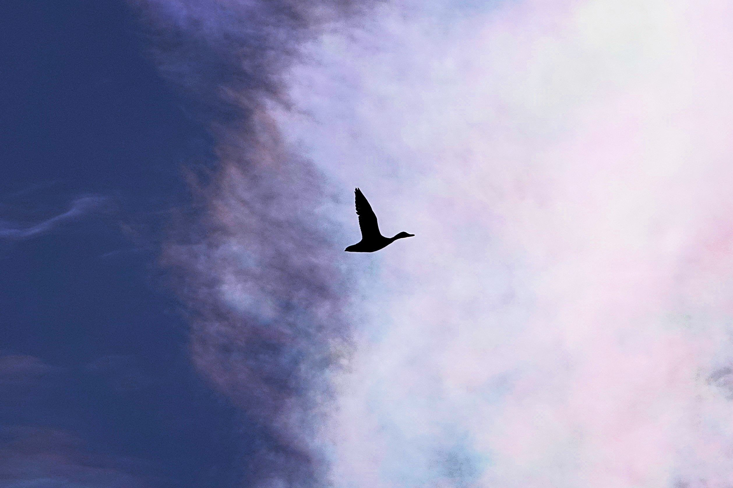 夕方近く空に綺麗な彩雲が出て見ているとそこにカルガモが1羽飛んできて撮って見ました。