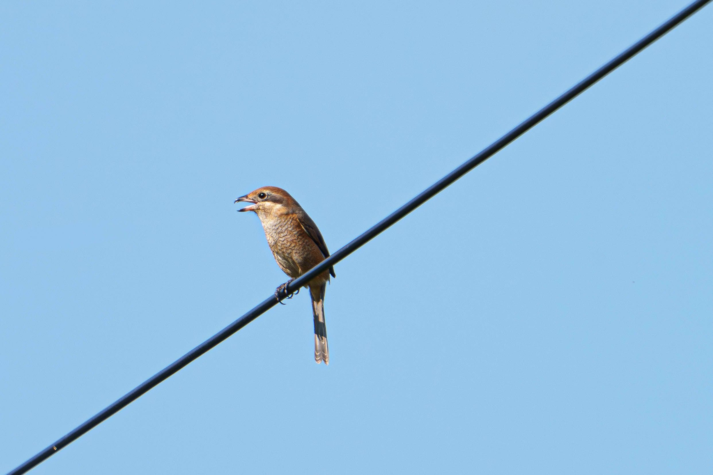 電線に百舌鳥が止まっていました。 よく見ると高鳴きしてましたよ。