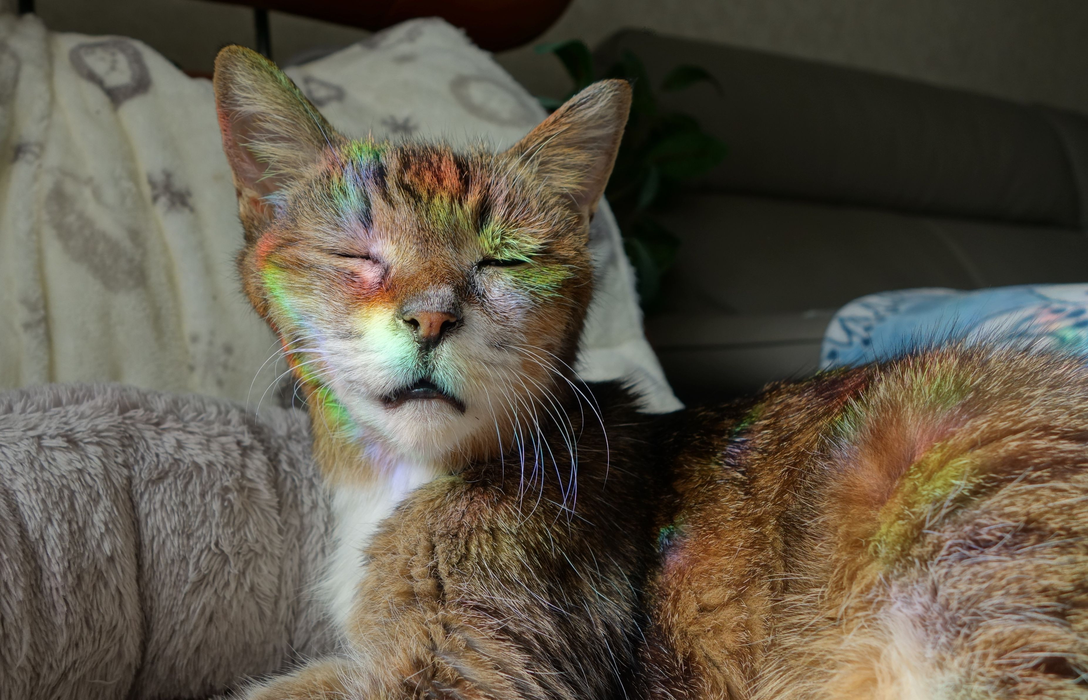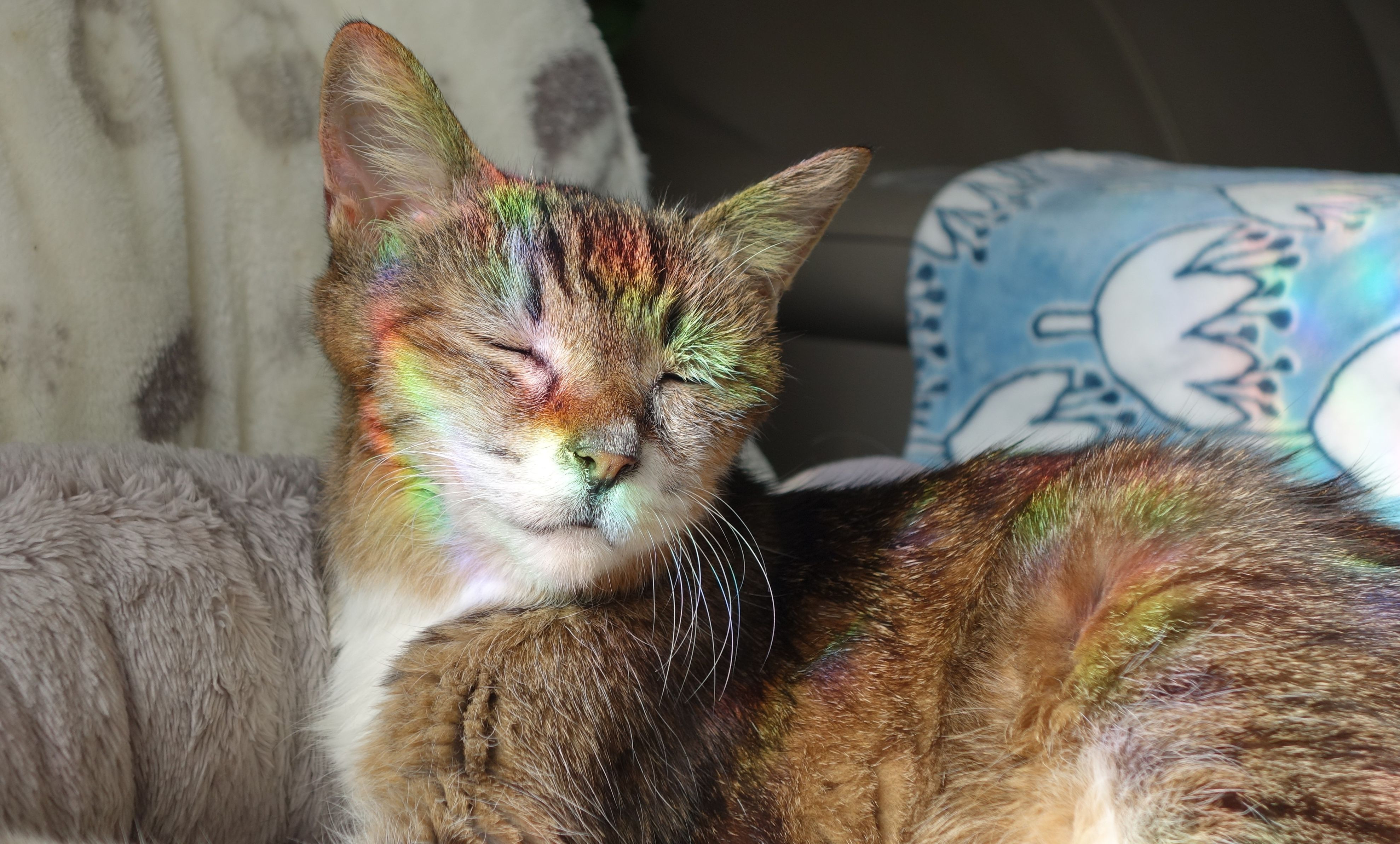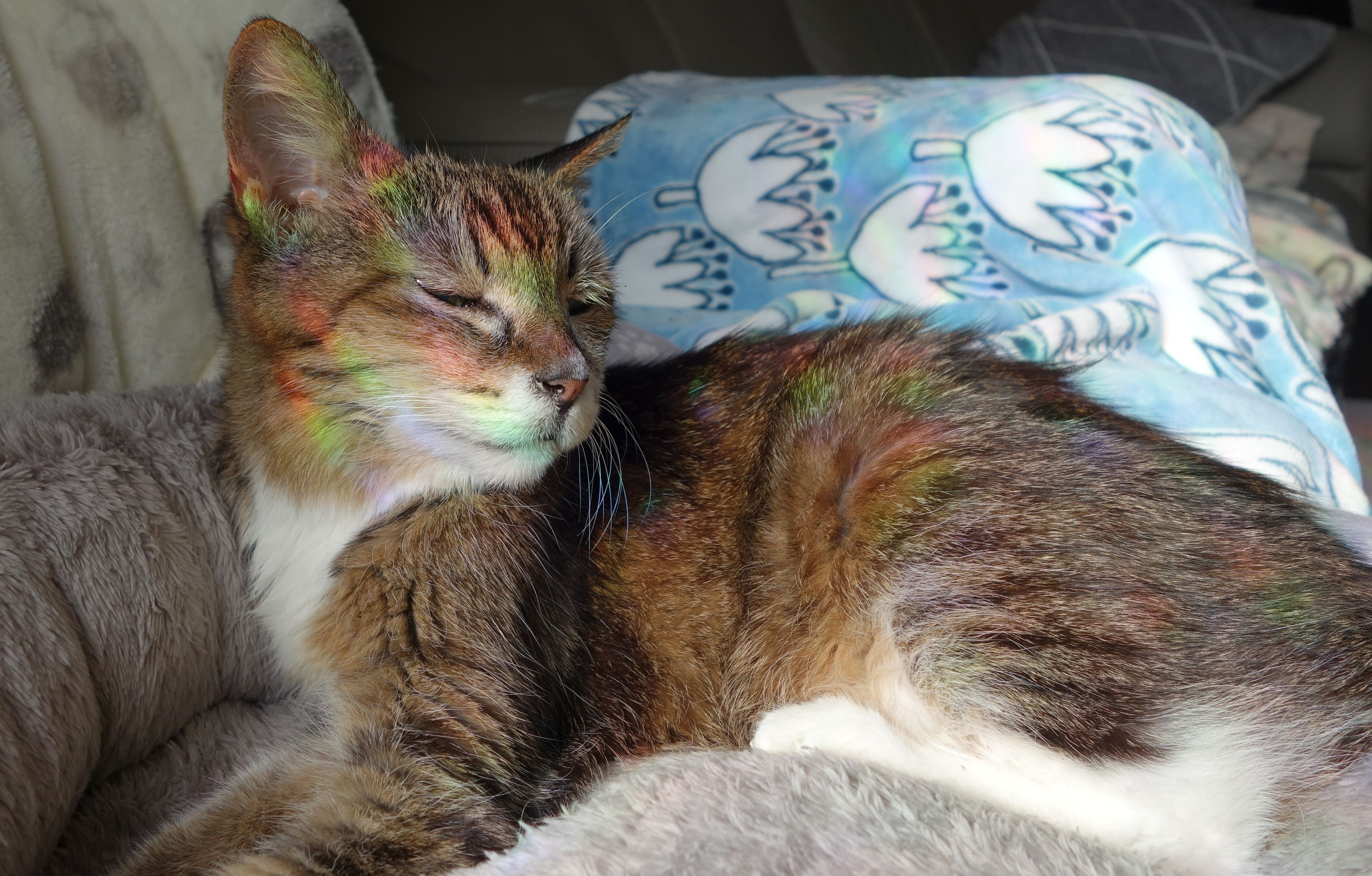 天気も良く、お天道様も力強かったので、しっかりとした虹色になっていました。 チビにとってはサンルーム状態? (全てトリミング有り)