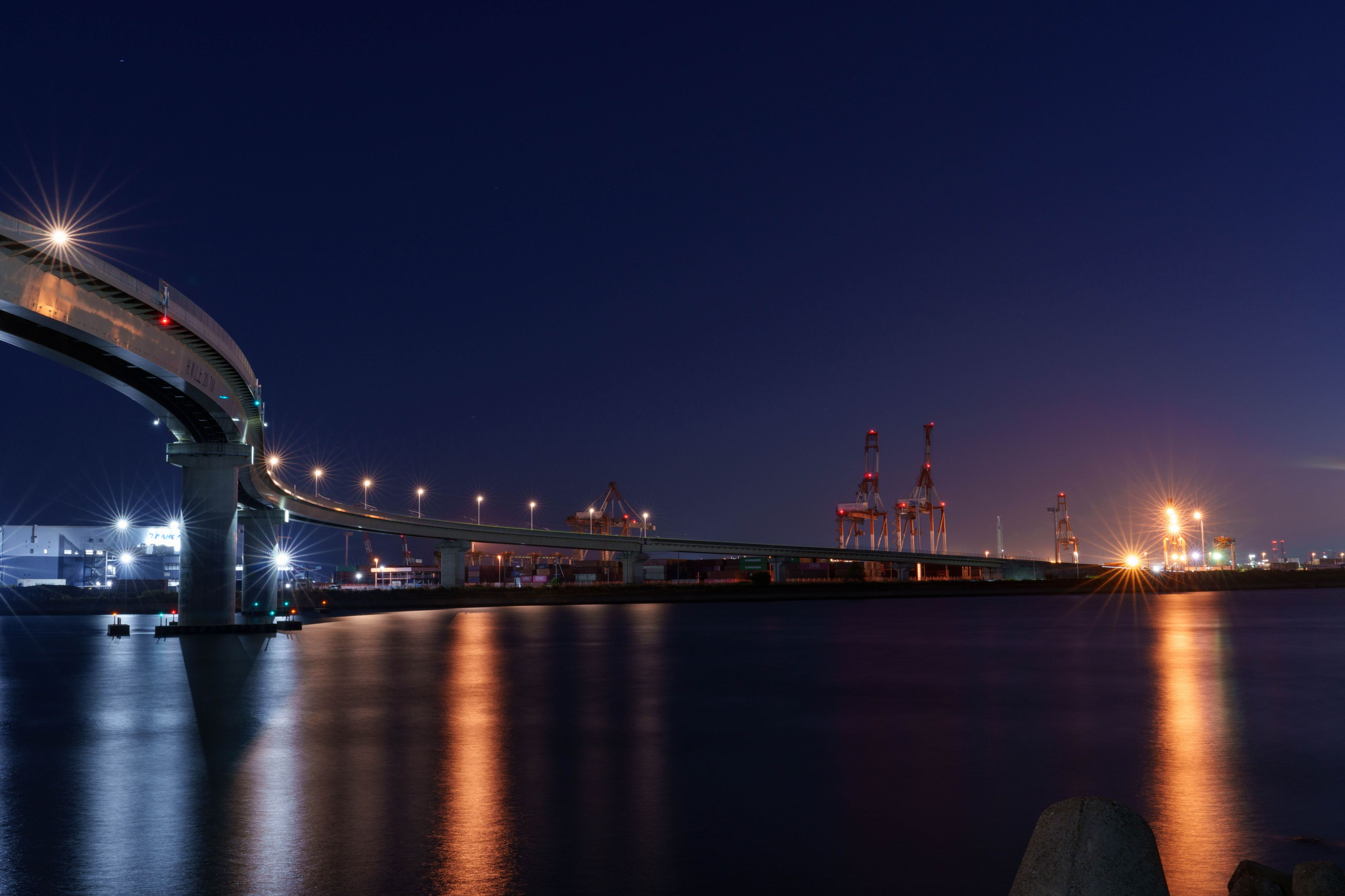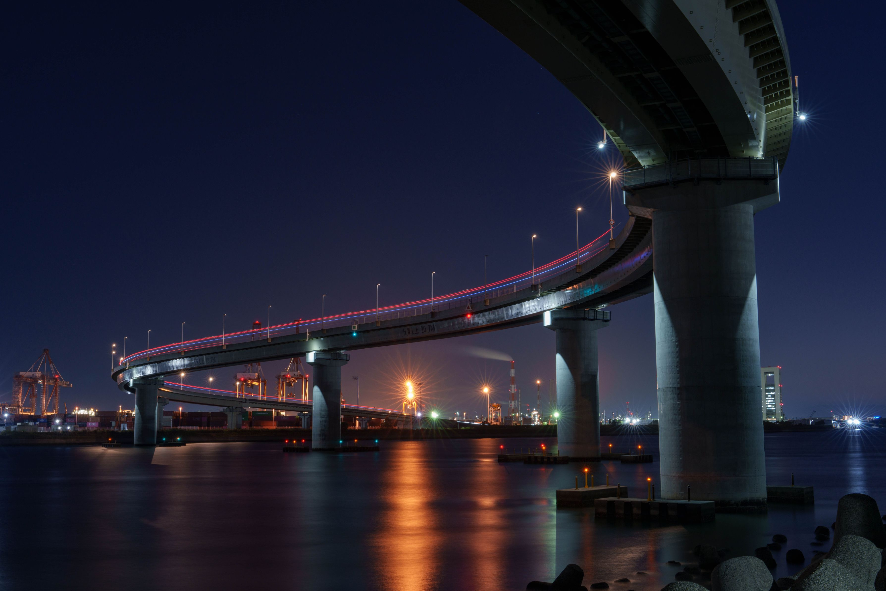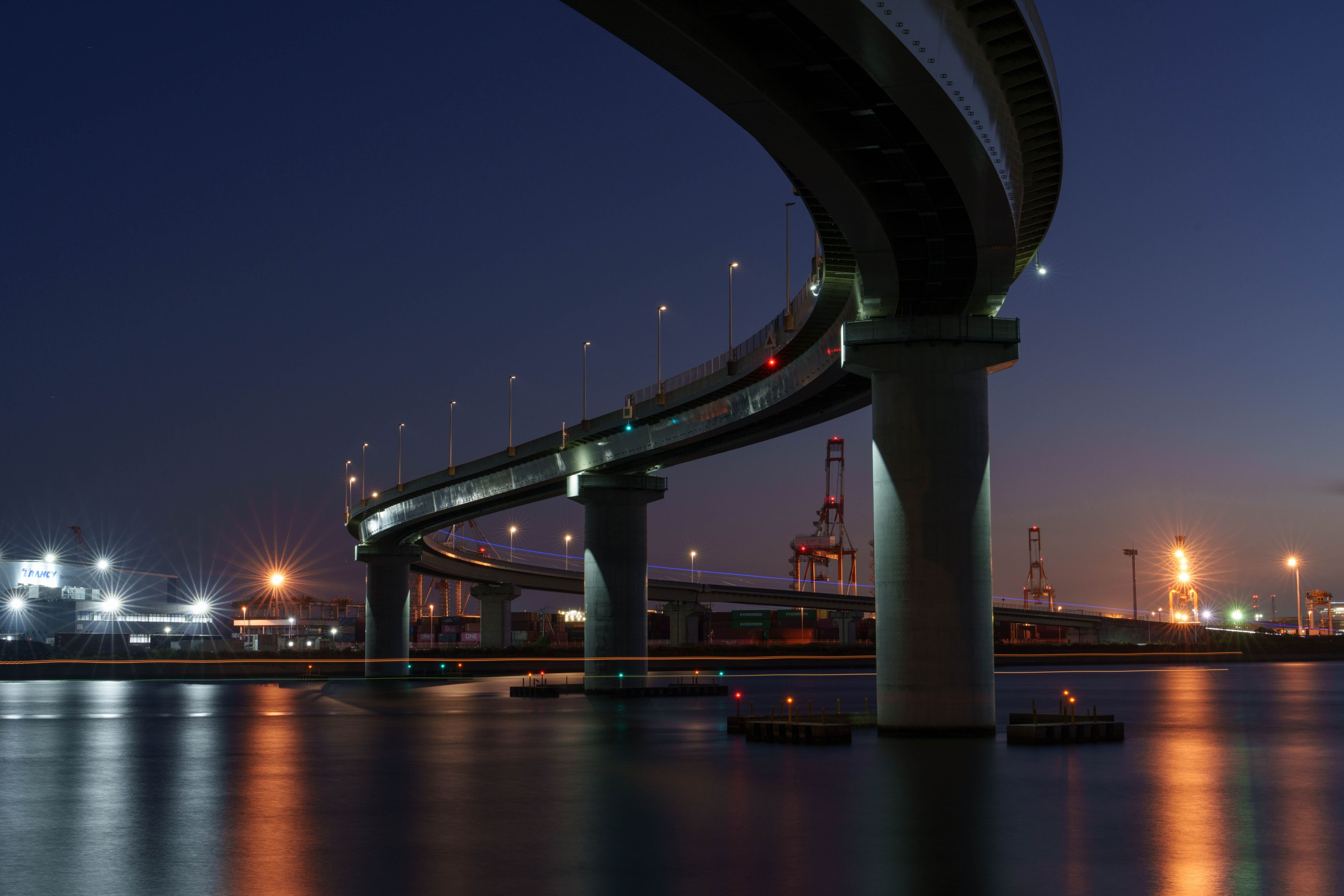 工場観賞愛好家の聖地・四日市コンビナートの夜景の中でも鉄板のひとつ。2018年4月に開通した産業道路。橋脚下から奥の方には霞コンビナート、手前にはコンテナターミナルも望めました。橋脚と工場夜景が観賞できる素晴らしいスポットでした!