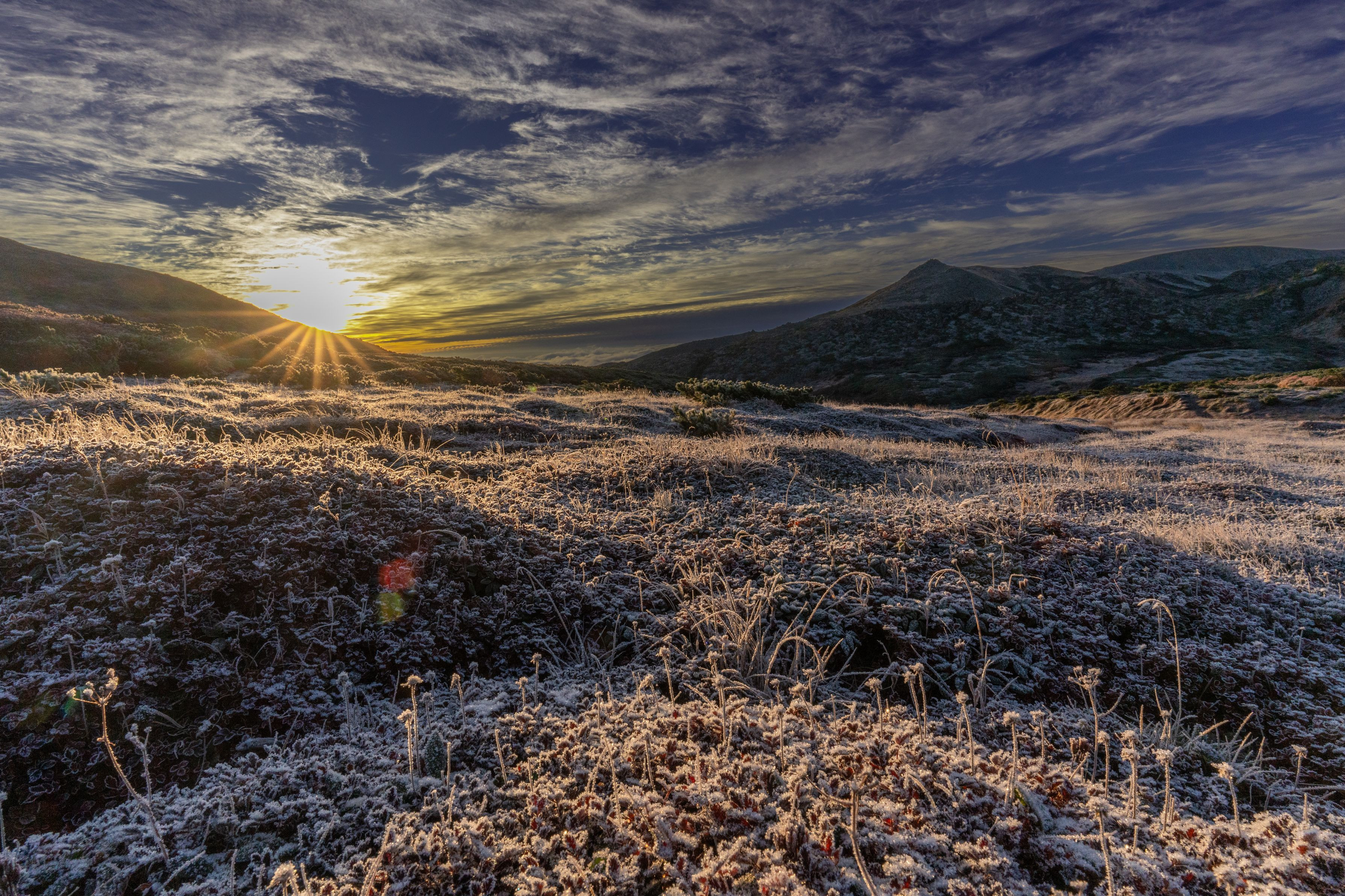 黒岳が初冠雪の朝 チングルマの紅葉が輝く