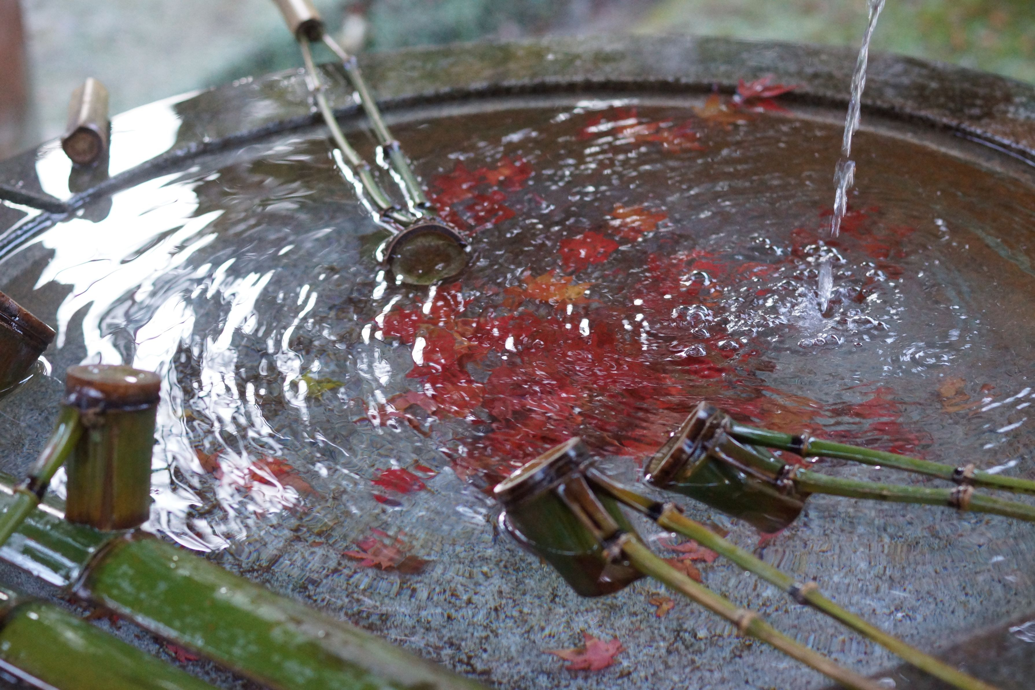 紅葉が手水鉢に落ちて、花手水のような彩りに。 水の躍動と紅葉の赤色を上手に映せたかな、 #愛知県# 撮影地:豊田市 香嵐渓(香積寺)