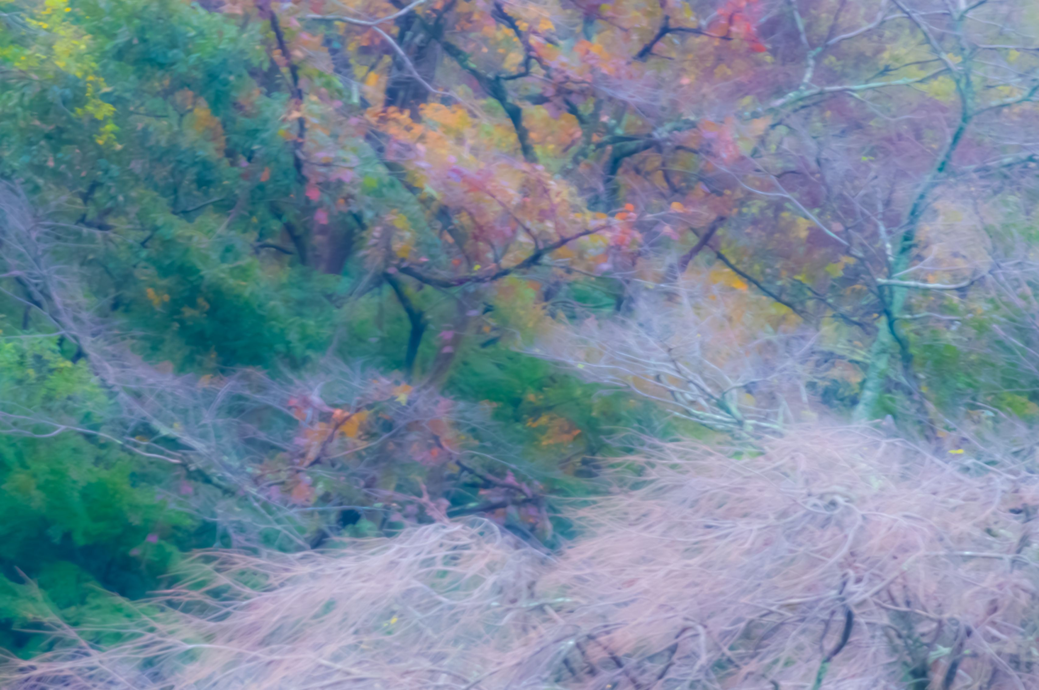 葉を落として来年の春を待つ枝垂れ桜。枝ぶりが何かの流れのよう。背景には緑と錦模様。オールド望遠レンズ(450㎜相当)とNEXC3で撮影した。ピントも甘く(これで精一杯!)手振れもあって、写真全体が幻想的な感じに・・・現像段階でさらに明瞭度を落とし、霞もややかけ、一層幻想的な感じになるように仕上げた。