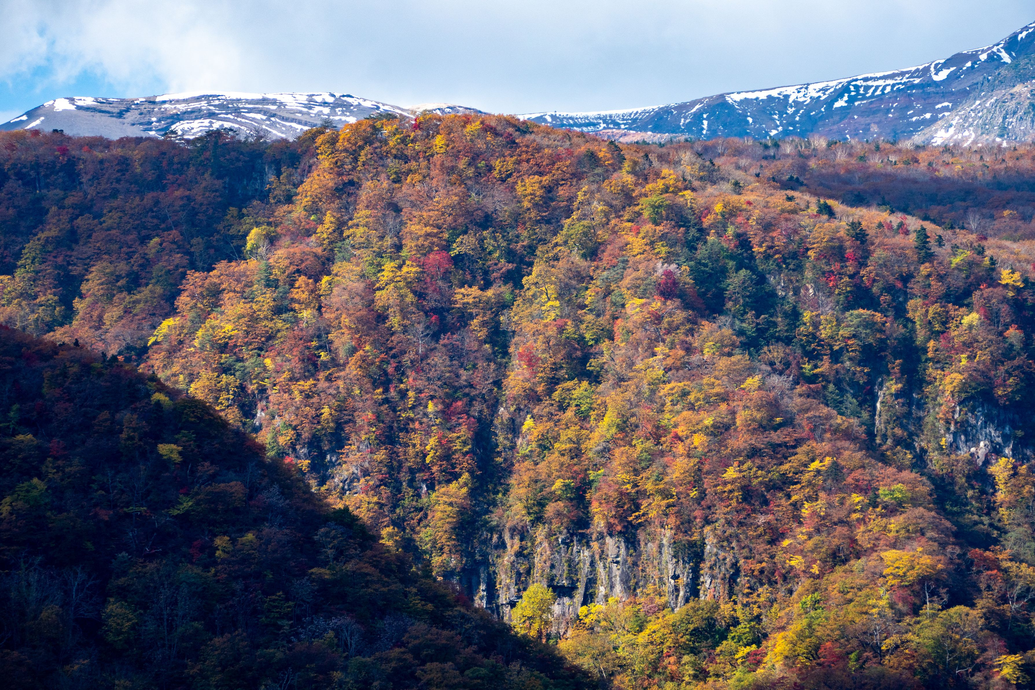 宮城蔵王の秋色景色。蔵王山頂は雪景色、もう直ぐ冬到来です。