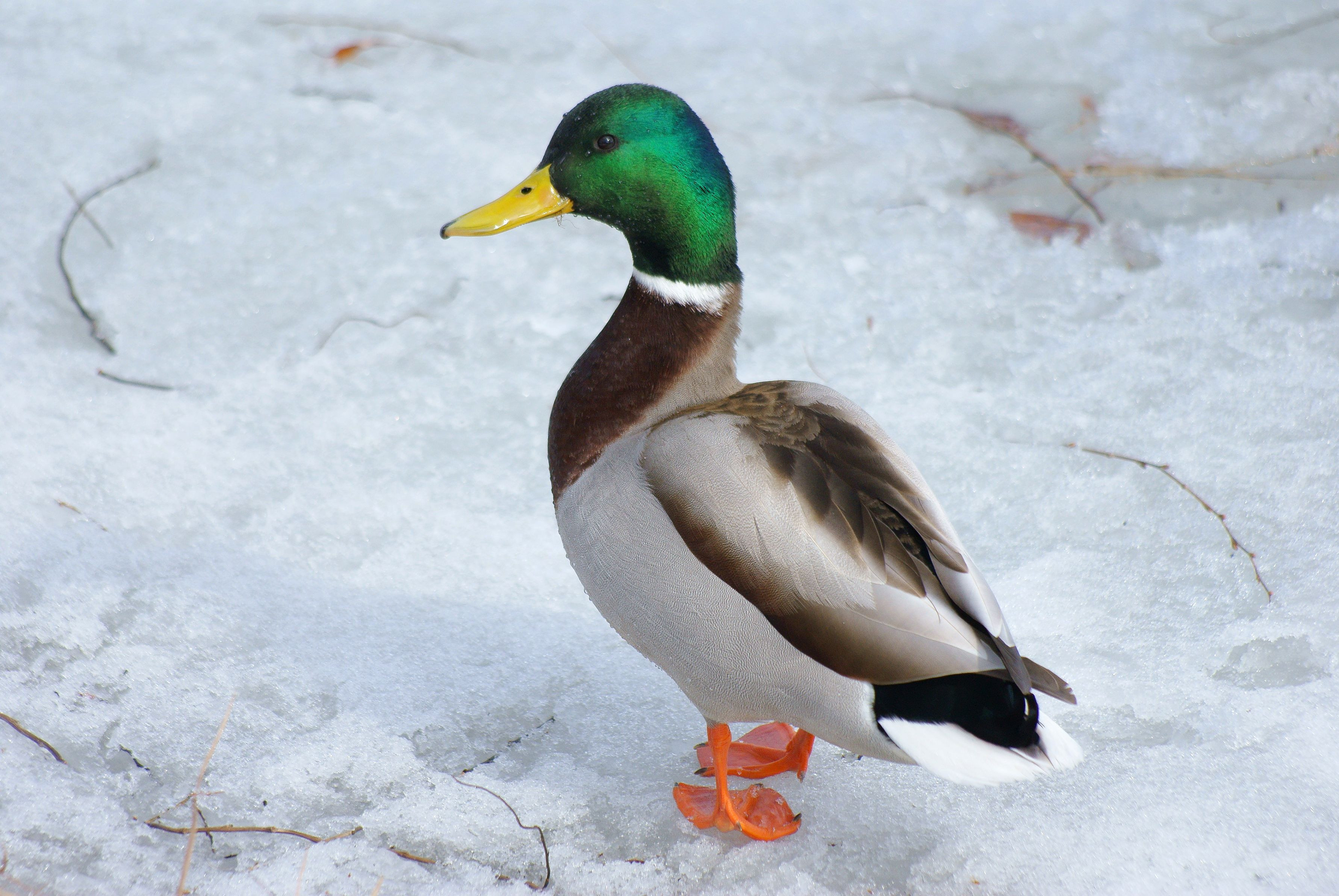 札幌中島公園にて。 白(氷)バックで特徴的なエメラルドグリーンと足のオレンジが引き立ちました。 てかしもやけにならないのだろうか?w Minolta AF APO Zoom 100-300mm f5.6