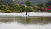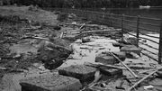 釣りを楽しむ人がいる一方、片付いていない大雨による流木なども。