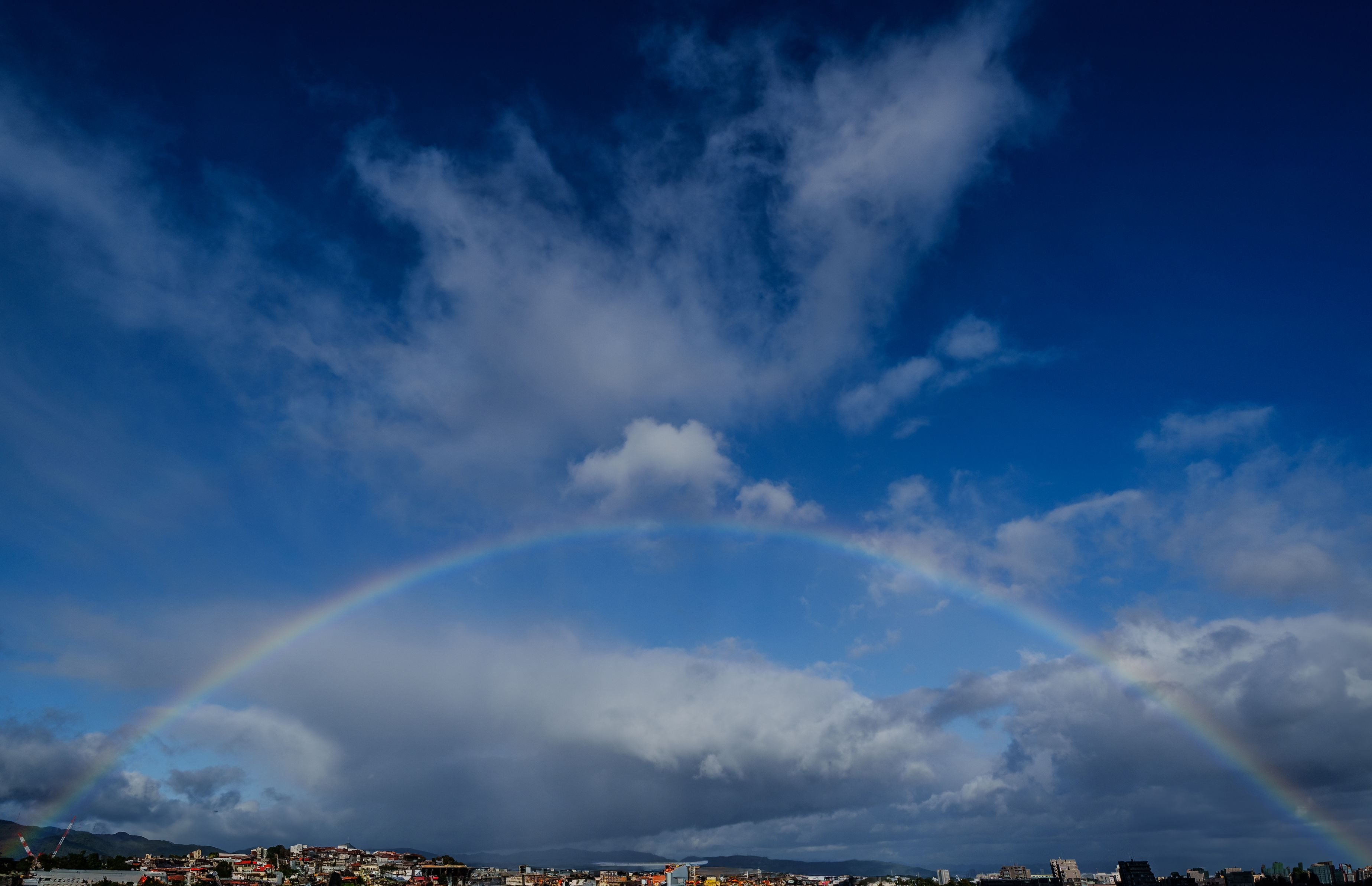 大きな虹がかかりました。 建物等は生成AIにて加工してありますが虹についてはほぼそのままです(根本あたりは怪しいです)